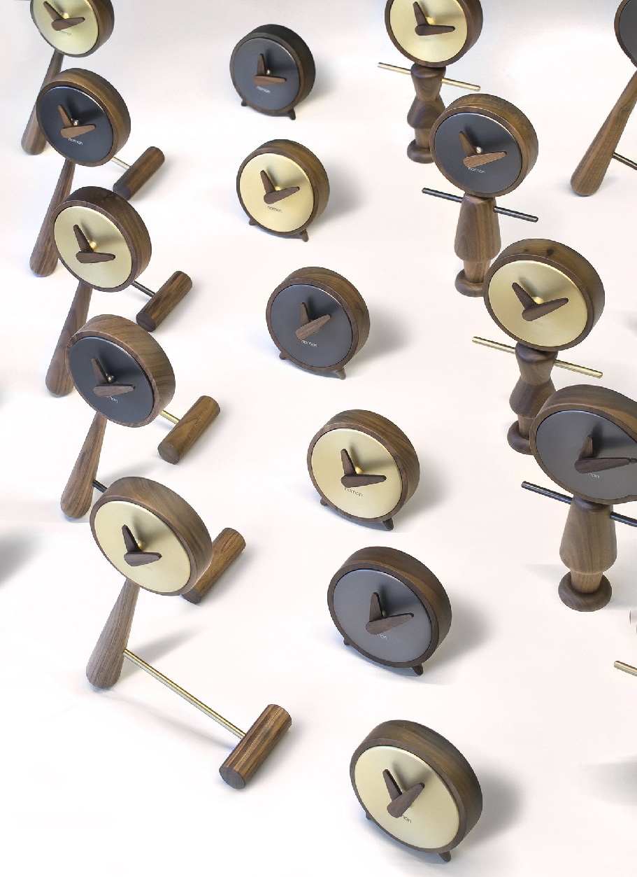 Маленькая и очаровательная, эта модель уменьшенного размера отличается чистым и изысканным дизайном. Его корпус из натурального ореха и отделка из полированной латуни или графита хорошо сочетаются как в настольном, так и в настенном исполнении. Настольные часы, выполненные из дерева ореха и полированной латуни.