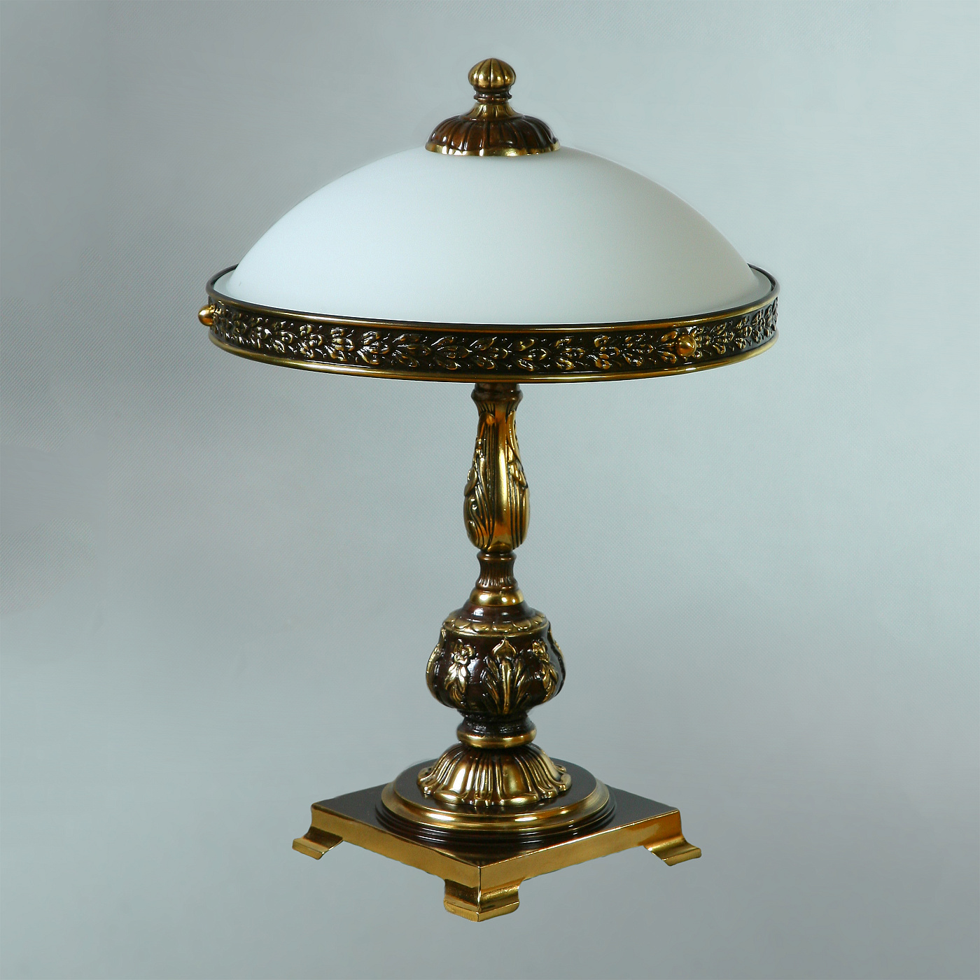 Настольная лампа, выполненная из латуни в блестящей бронзовой отделке и абажуром из белого стекла.