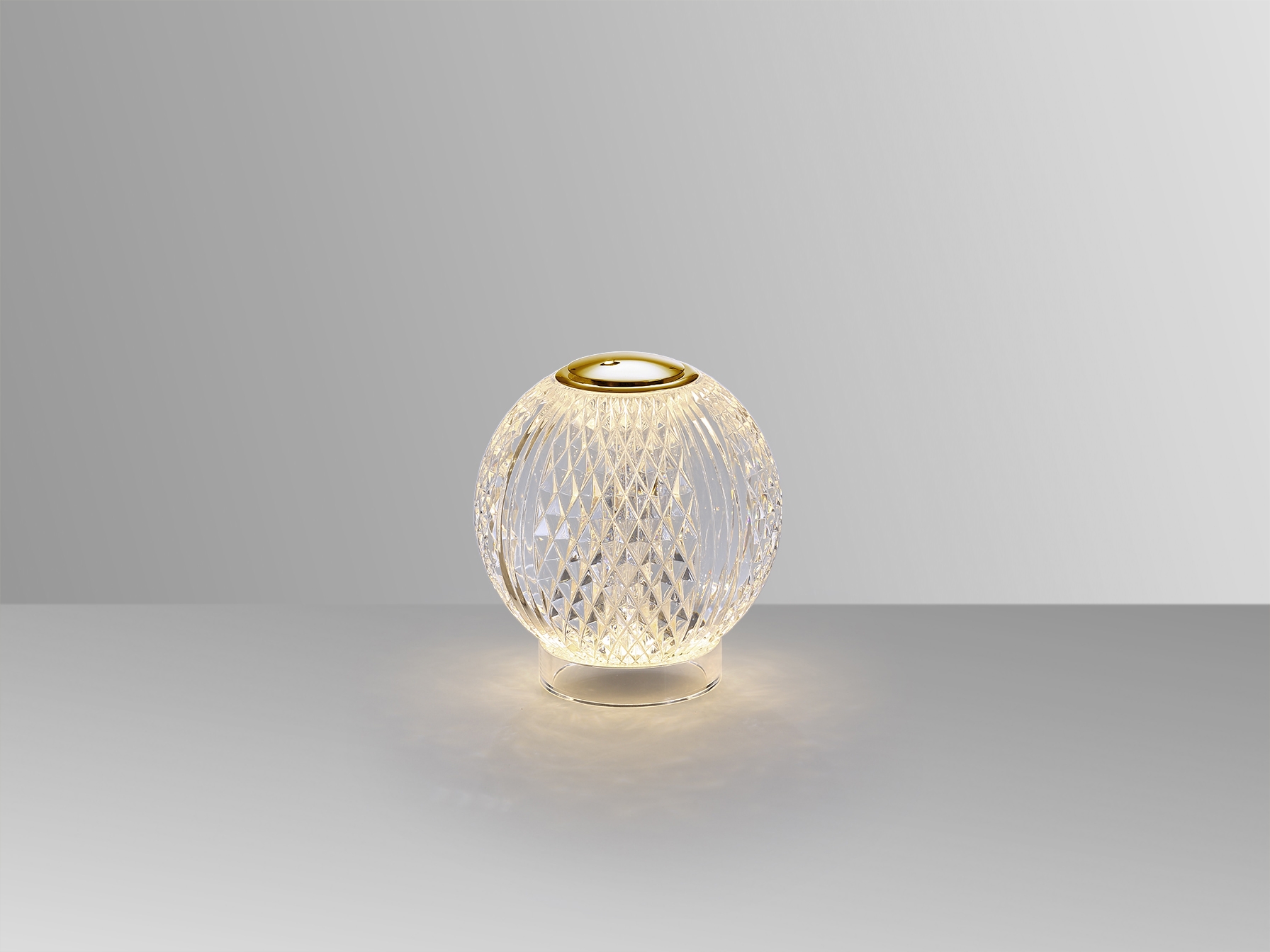 Настольная лампа с 1 светодиодной лампой, металлическая, с золотым покрытием. Сферический абажур диаметром 9 см из прозрачного оптического акрила, имитирующего резной хрусталь. Аккумуляторная, USB-кабель в комплекте. Светодиод мощностью 1,5 Вт. Цветовая температура 3000 К. Цветовая температура 112 лм.