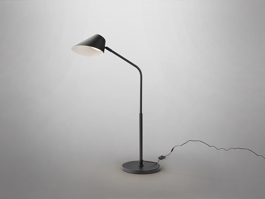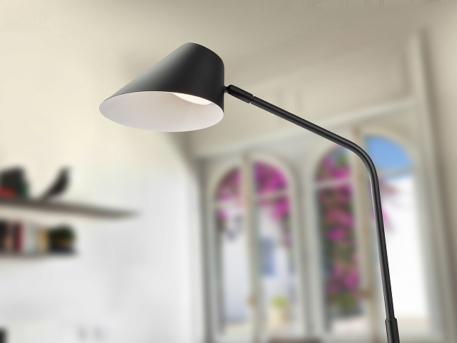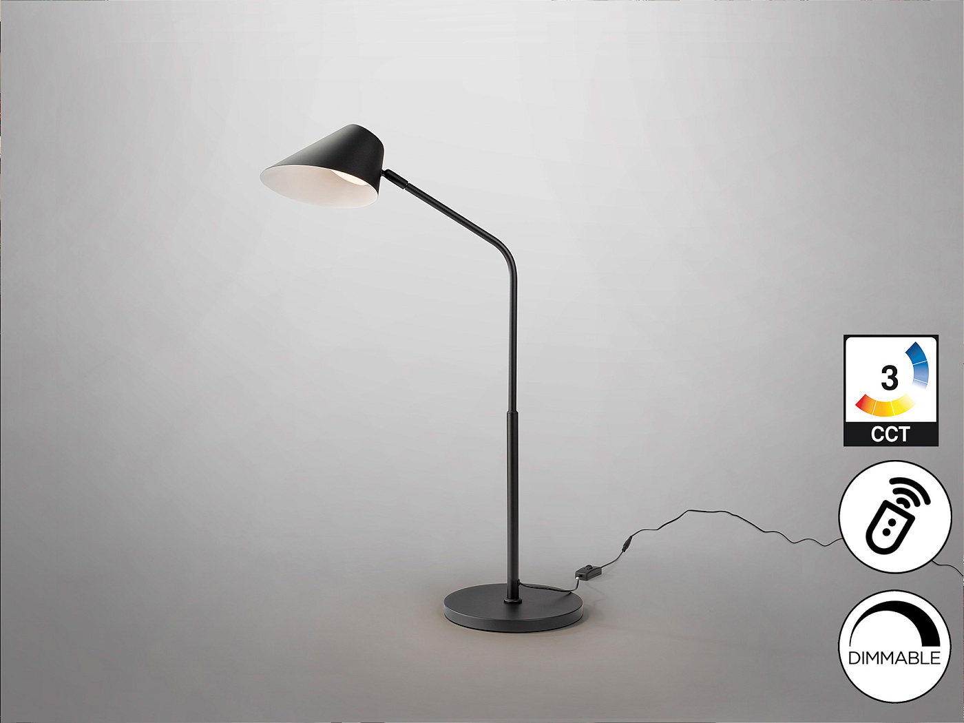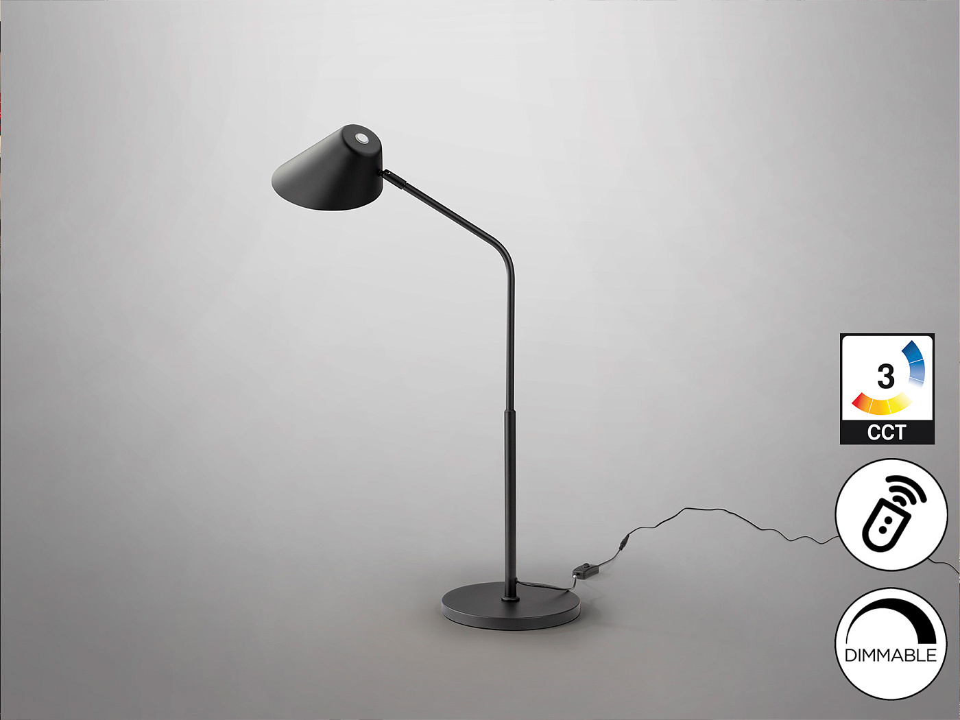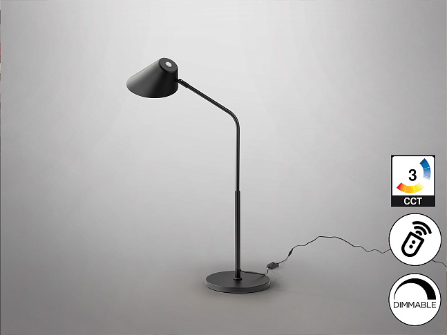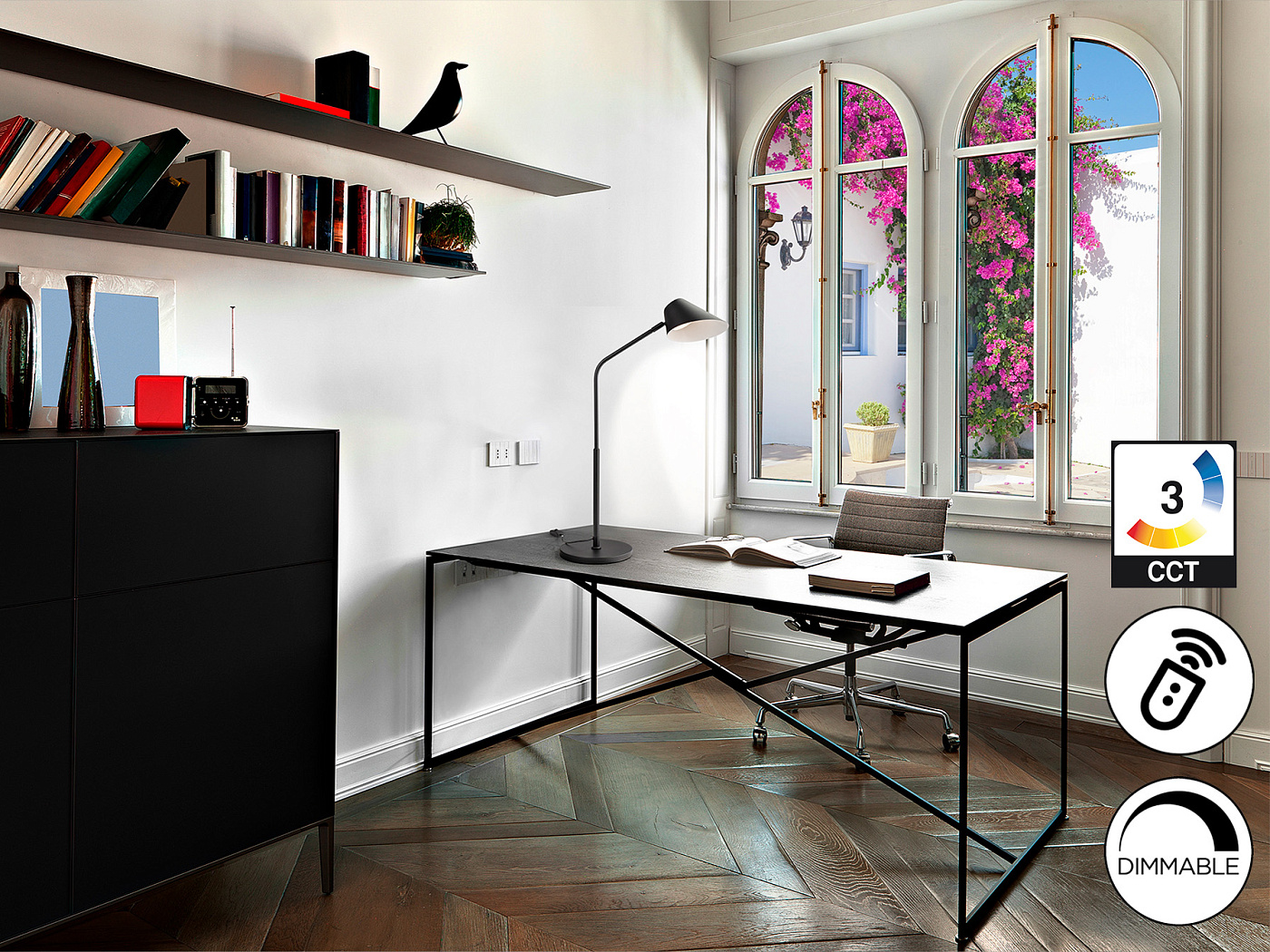 Настольная лампа из металла и алюминия, матово-черная отделка, опаловый рассеиватель. Тактильная кнопка и ПУЛЬТ ДИСТАНЦИОННОГО УПРАВЛЕНИЯ. Регулируемый прожектор, регулировка яркости света, регулируемая цветовая температура. Светодиод 12 Вт, 1300 лм, CCT 3000K-6500K