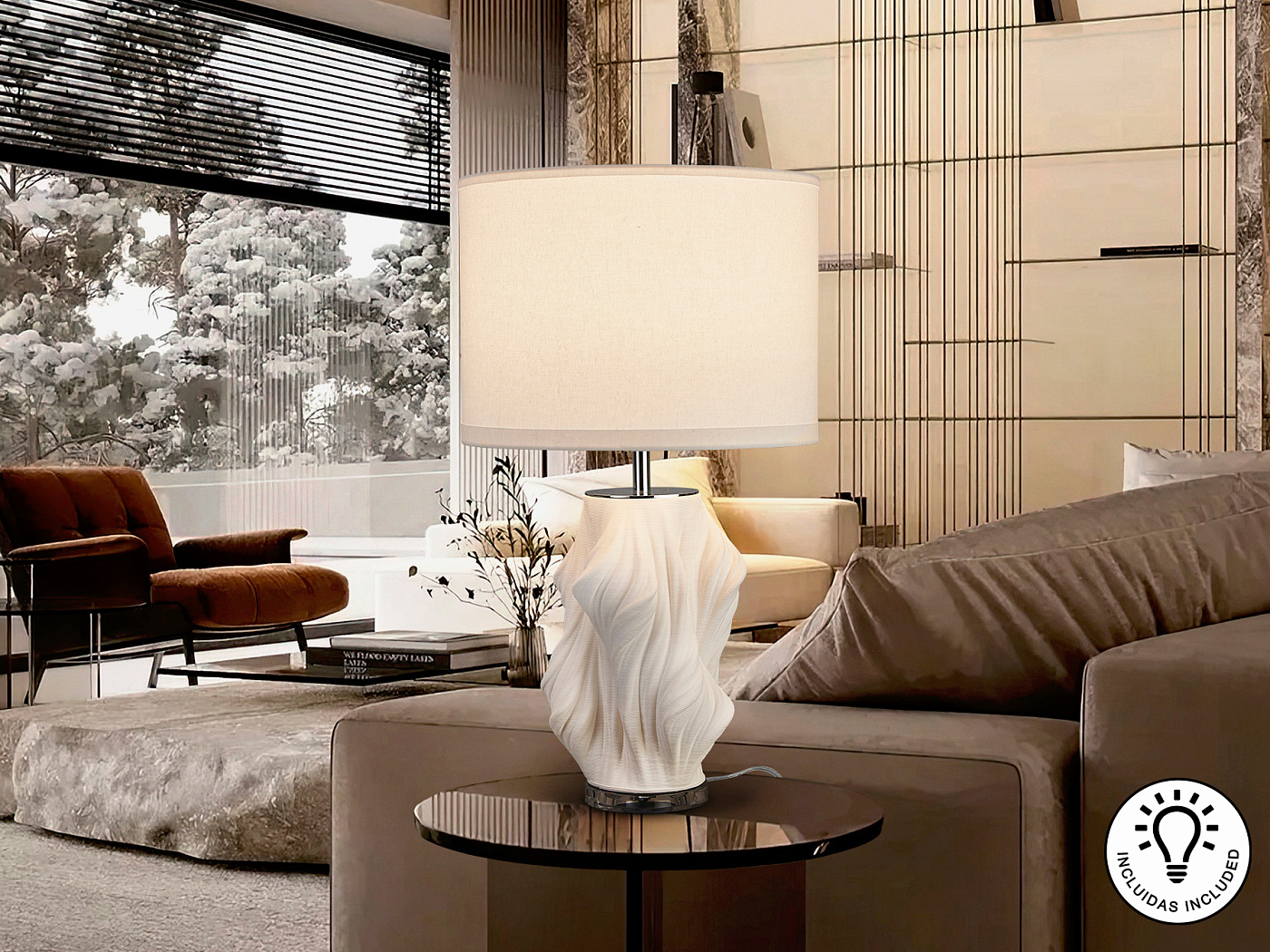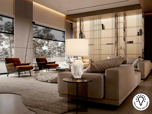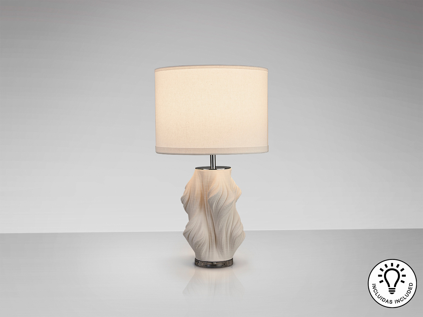 Настольная лампа на 1 лампу. Изготовлена из керамики белого цвета, напечатанной на 3D-принтере, хромированного металла и основания из прозрачного акрила. Абажур из белого текстиля. ·В комплект входит 1 светодиод E27 мощностью 10 Вт.