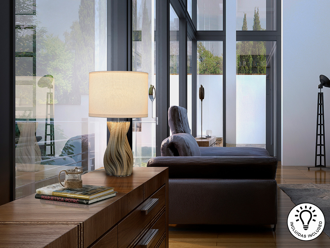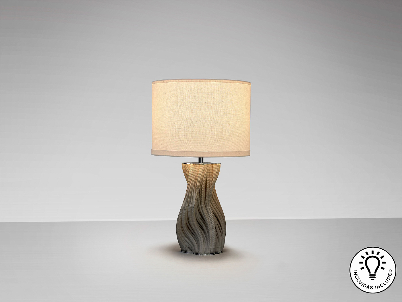 Настольная лампа на 1 лампу. Изготовлена из керамики, напечатанной на 3D-принтере, светло-серого цвета и хромированного металла. Абажур из белого текстиля. ·В комплект входит 1 светодиод E27 мощностью 10 Вт.