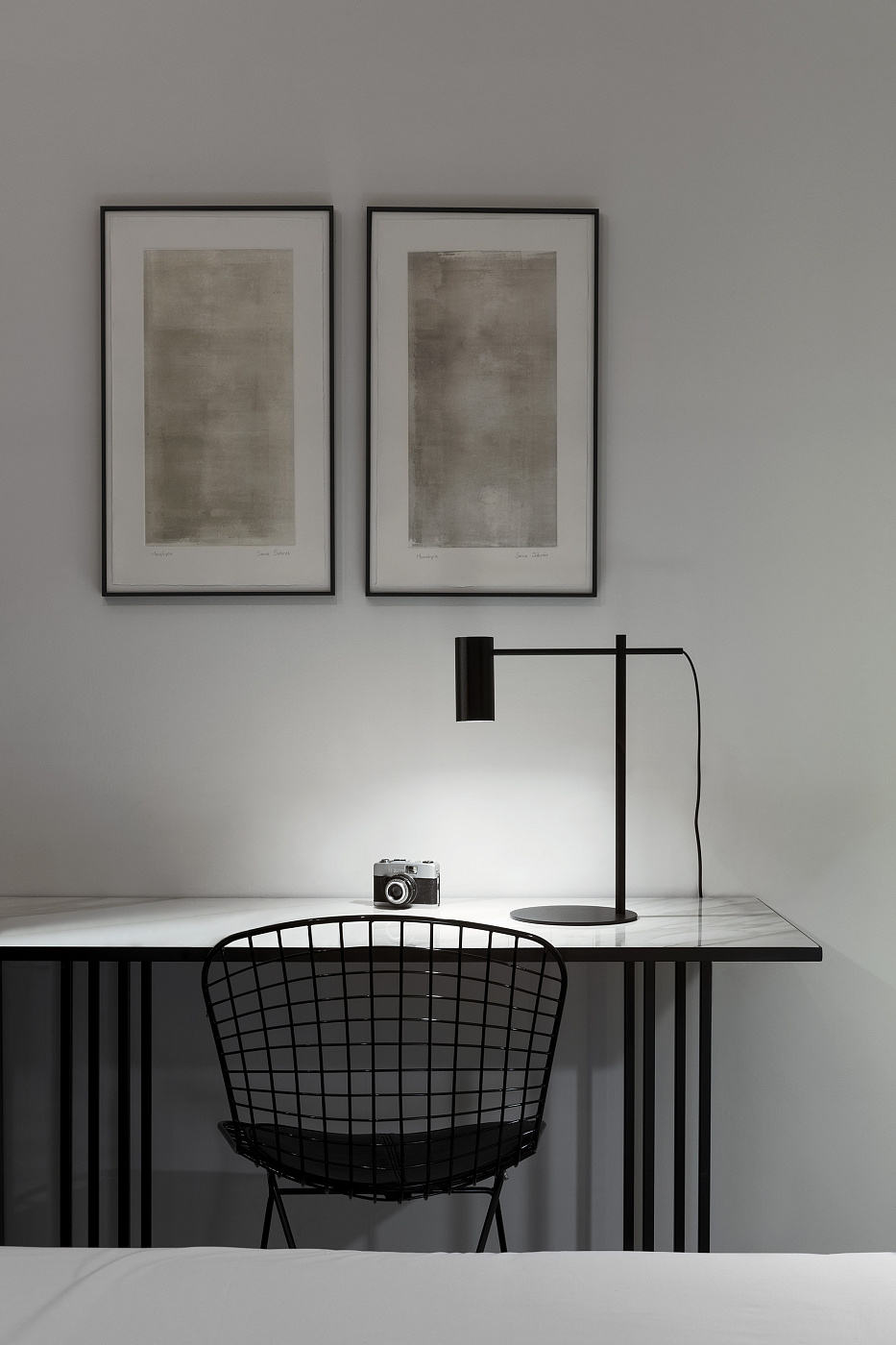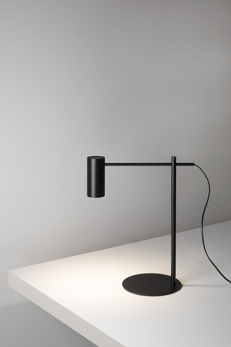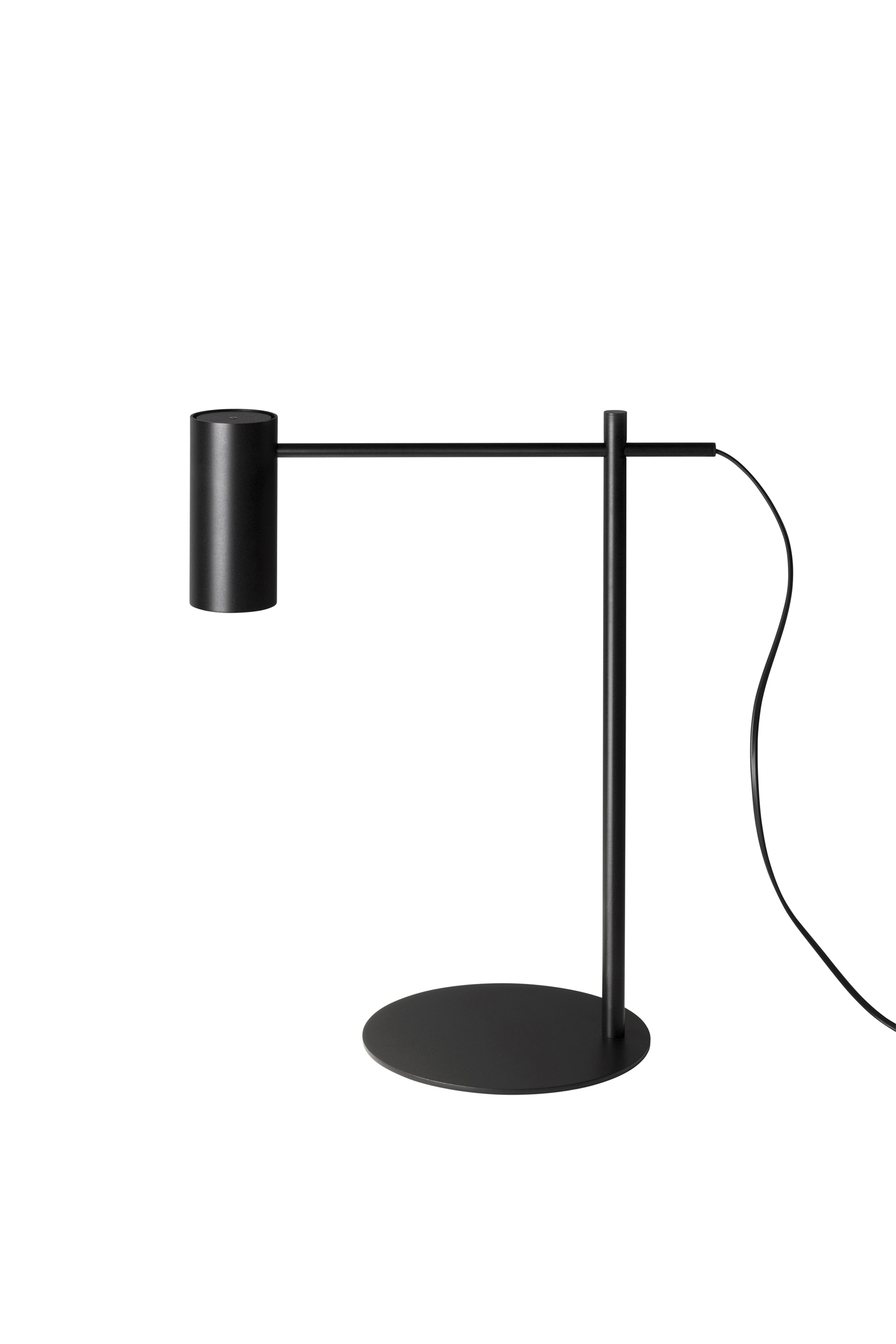 Минималистичная металлическая настольная лампа с цилиндрической головкой. Регулируемая считывающая рука с горизонтальным перемещением и вращением на 360º. Переключатель шнура включения/выключения.