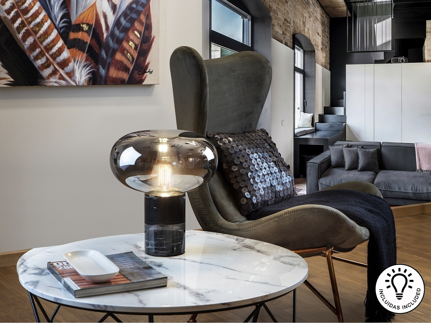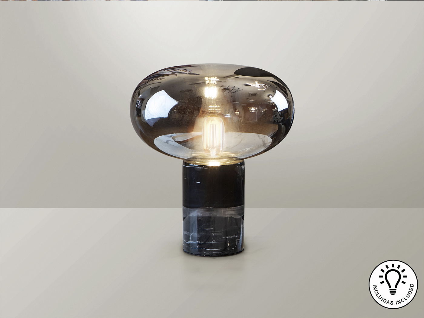 Настольная лампа 1 лампочка. Изготовлен из черного мрамора. Абажур из дутого стекла, дымчатый зеркальный цвет. Этот товар включает в себя 1 светодиод E27 8 Вт. DIMABLE.