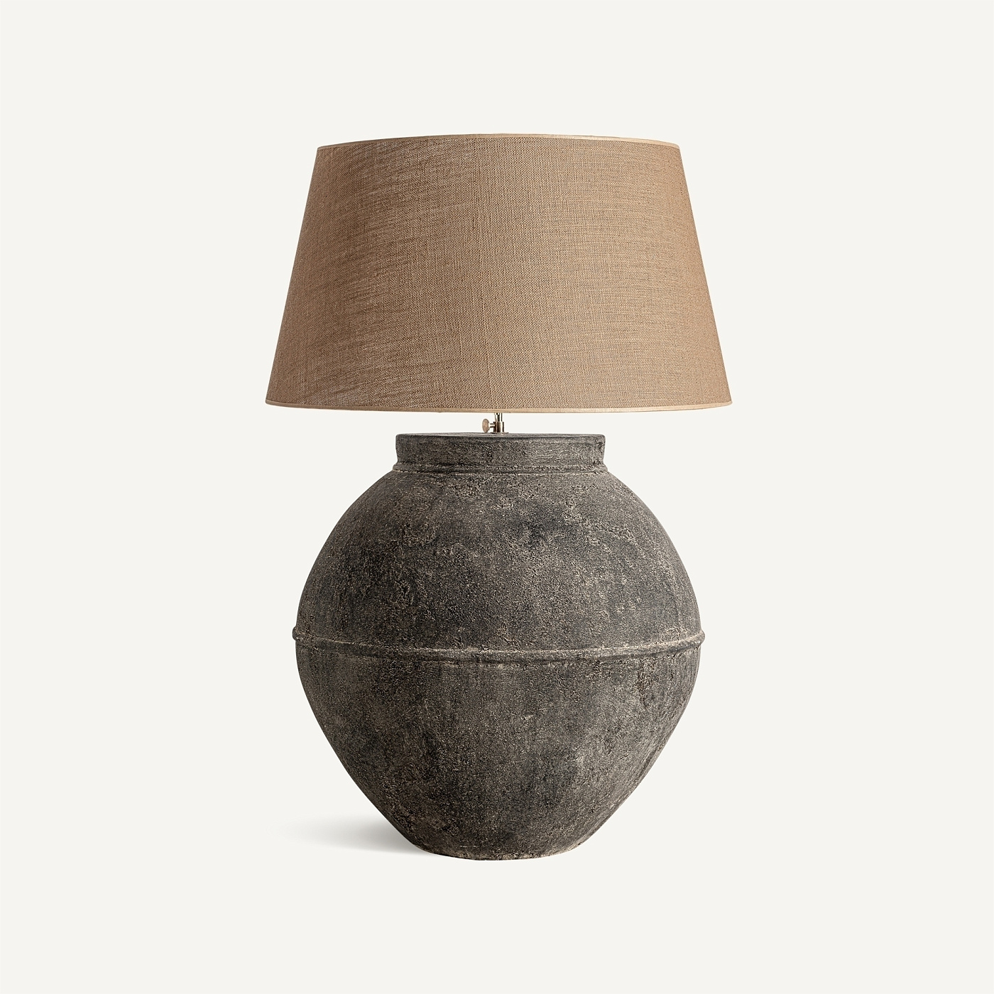 Настольная лампа в современном стиле, выполненная из серой терракоты с эффектом состаривания в сочетании с коричневой джутовой отделкой. Изделие разборное. Ширина: 50 см, Глубина: 55 см, Высота: 80 см