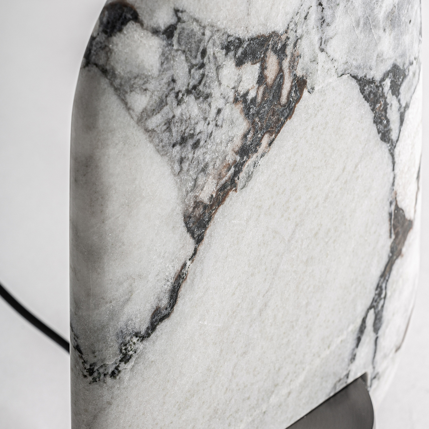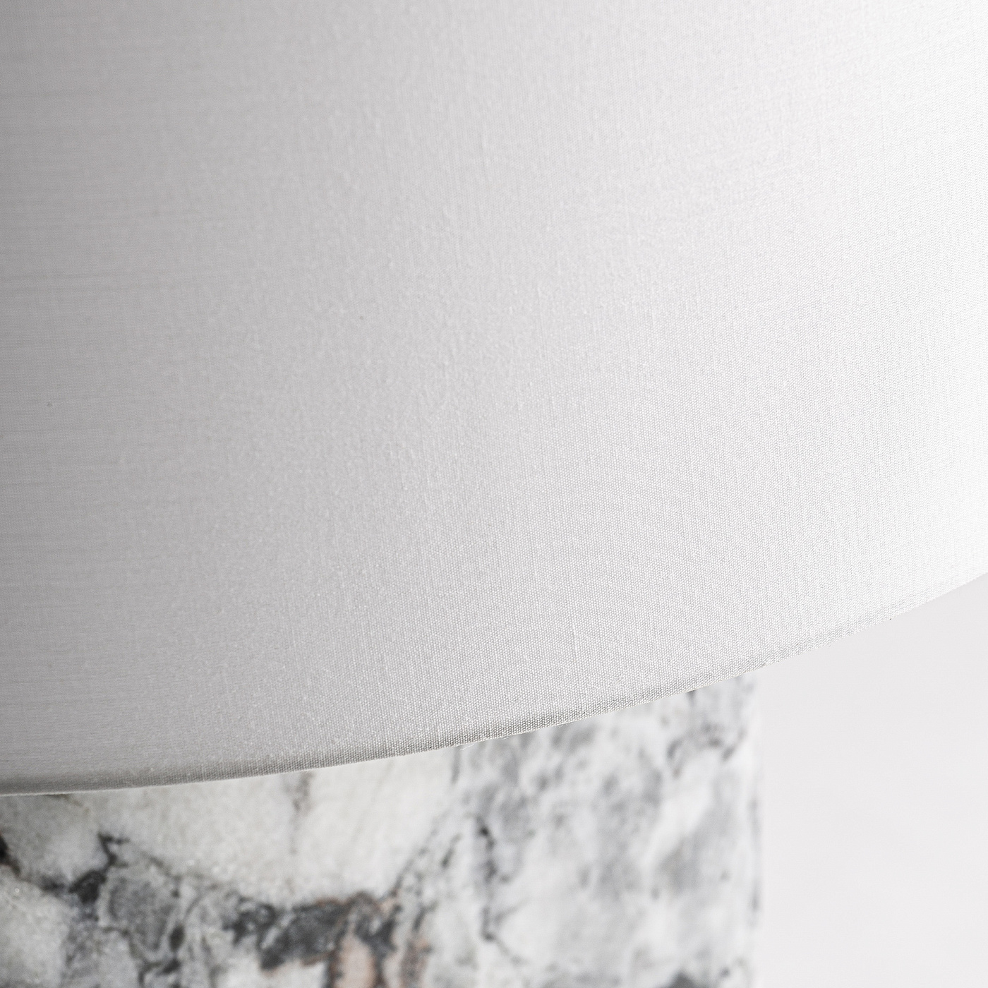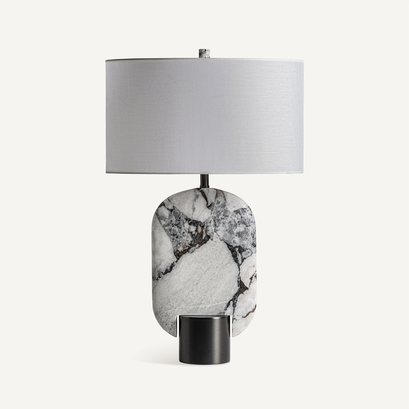 Настольная лампа из белого мрамора в сочетании с черным металлом с матовой отделкой и полиэстером кремового цвета.
