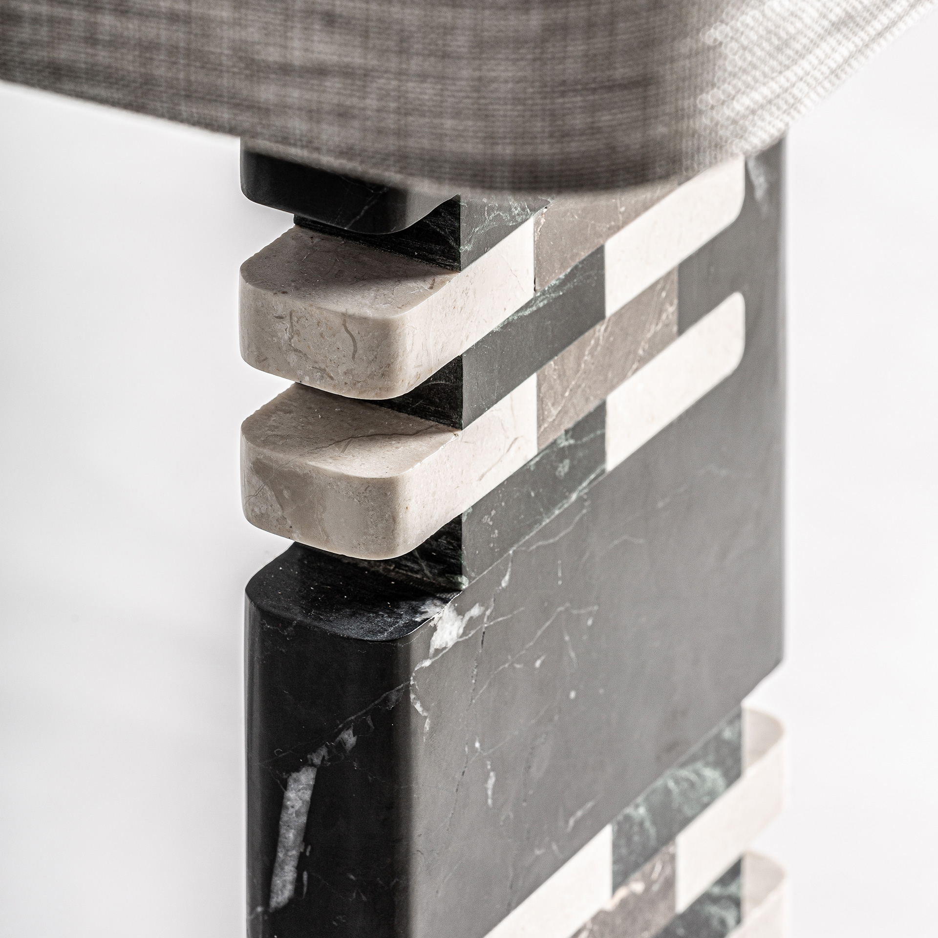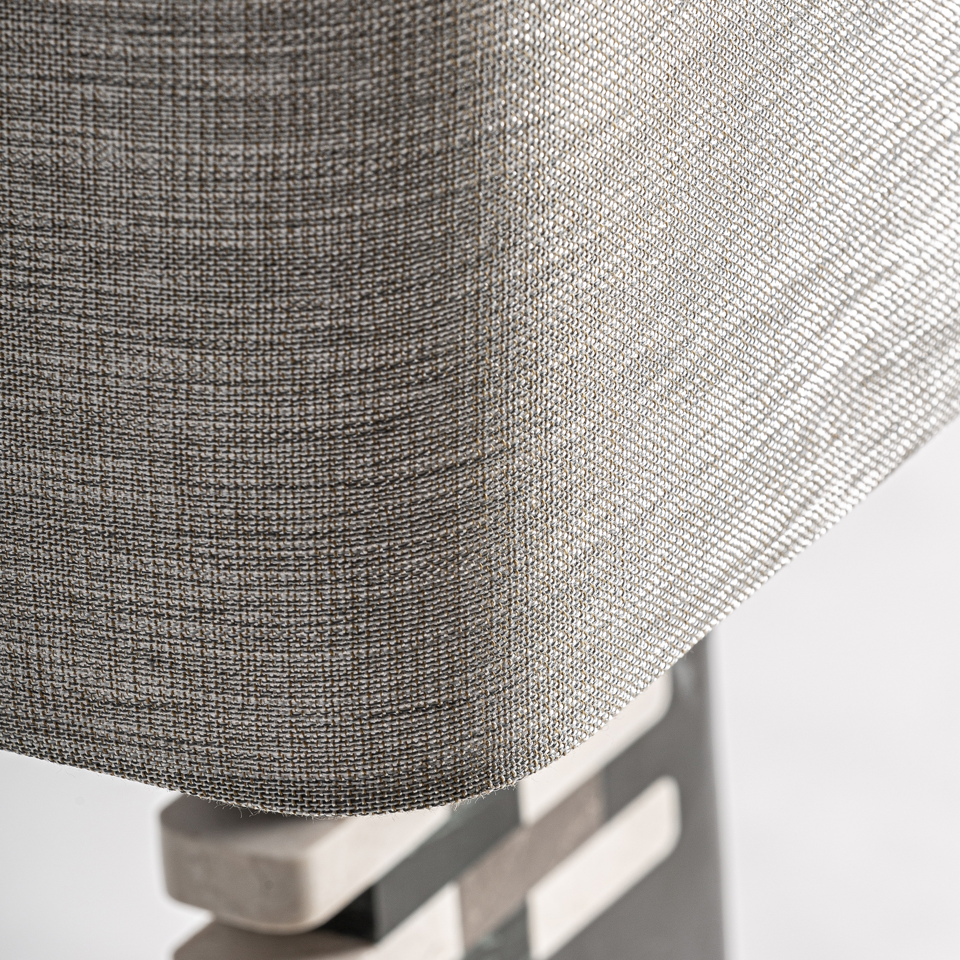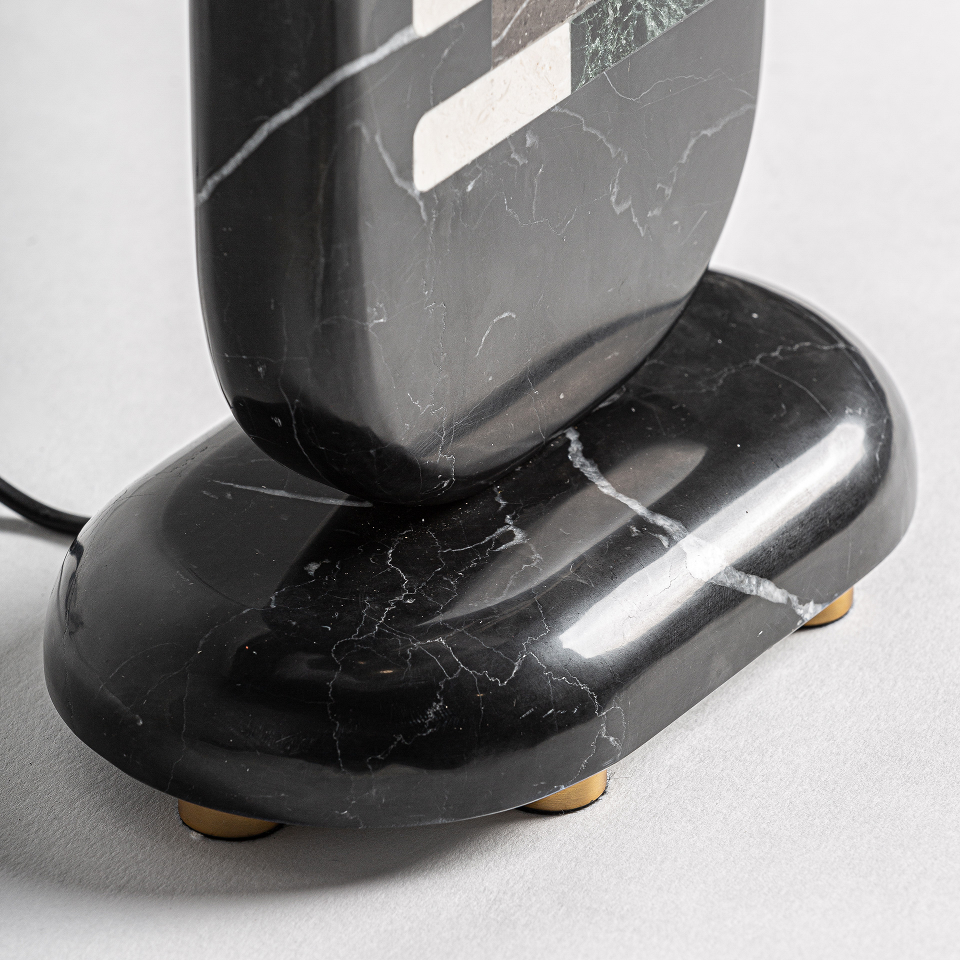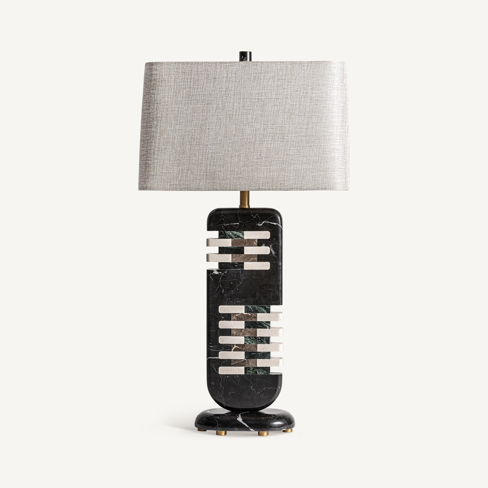 Настольная лампа из черного мрамора в сочетании с металлом золотистого цвета и полиэстером песочного цвета с пятнистой отделкой.