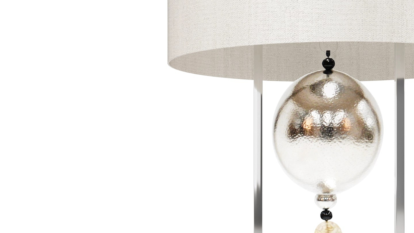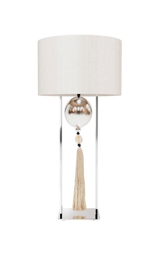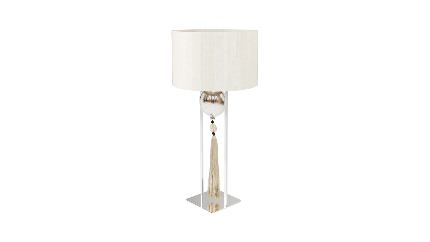 Линейный металлический каркас настольной лампы ACCRA блестит при освещении и смягчается цилиндрическим тканевым абажуром и сменной декоративной подвеской.