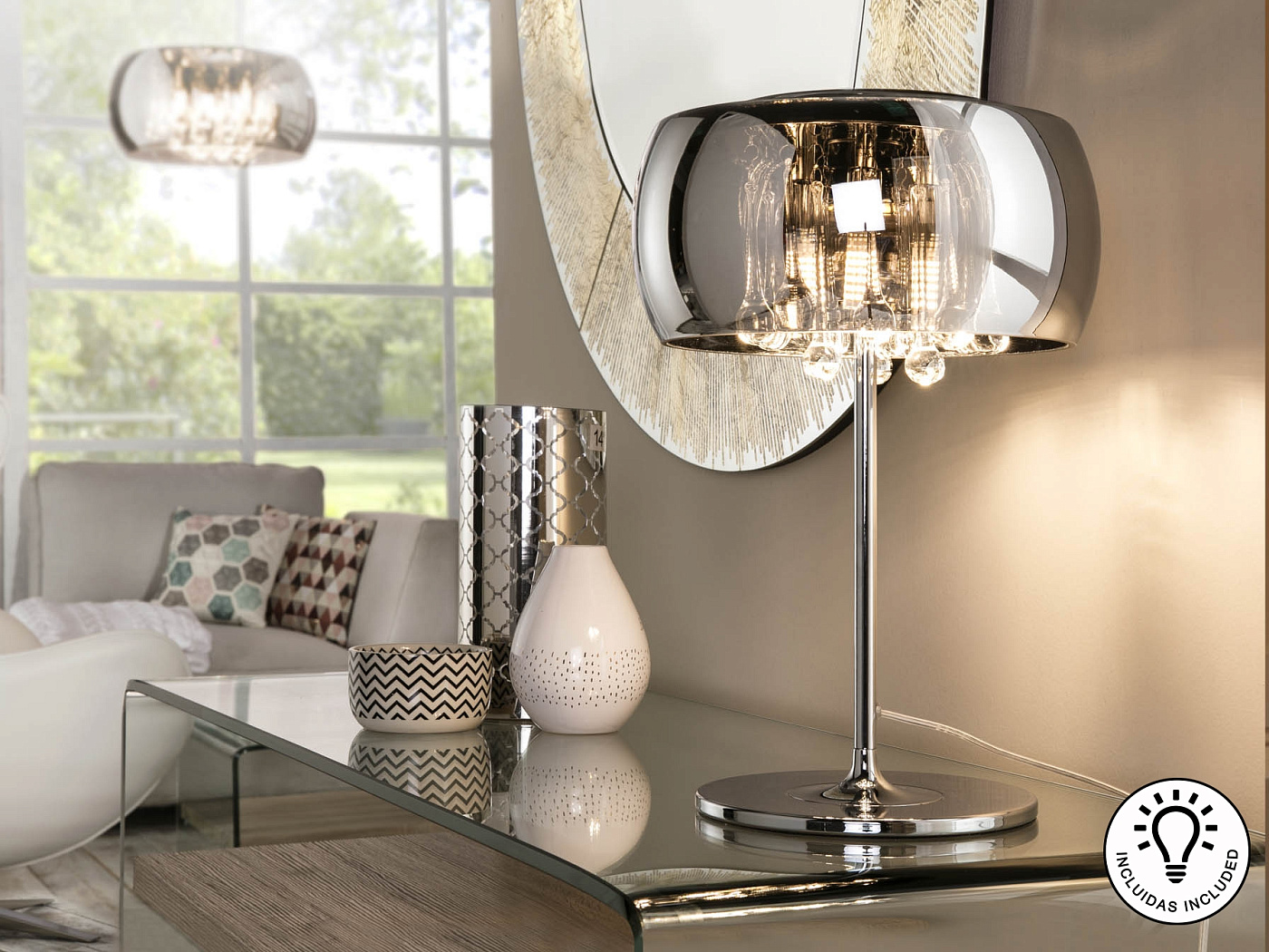 Настольная лампа из металла с покрытием "хром", плафон из зеркального стекла с подвесками внутри из стекла подобного муранскому, Включает 3 светодиода G9 мощностью 6 Вт.