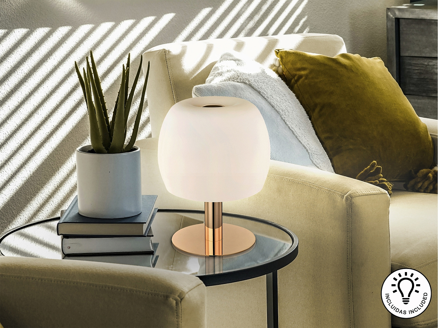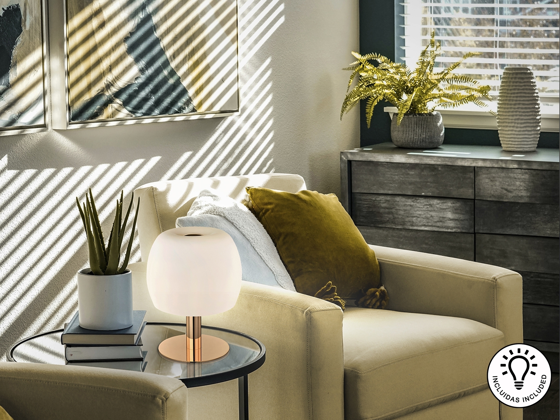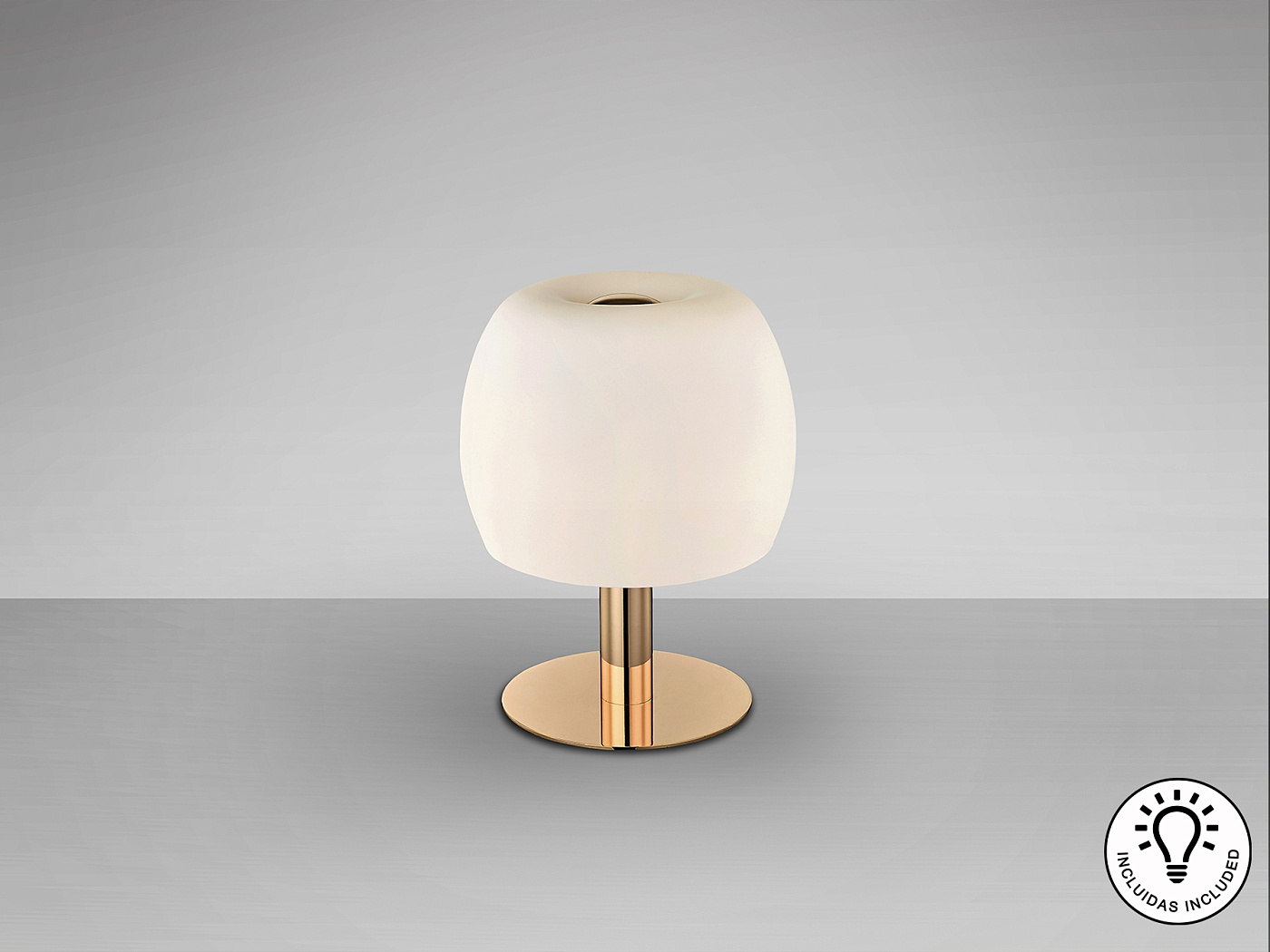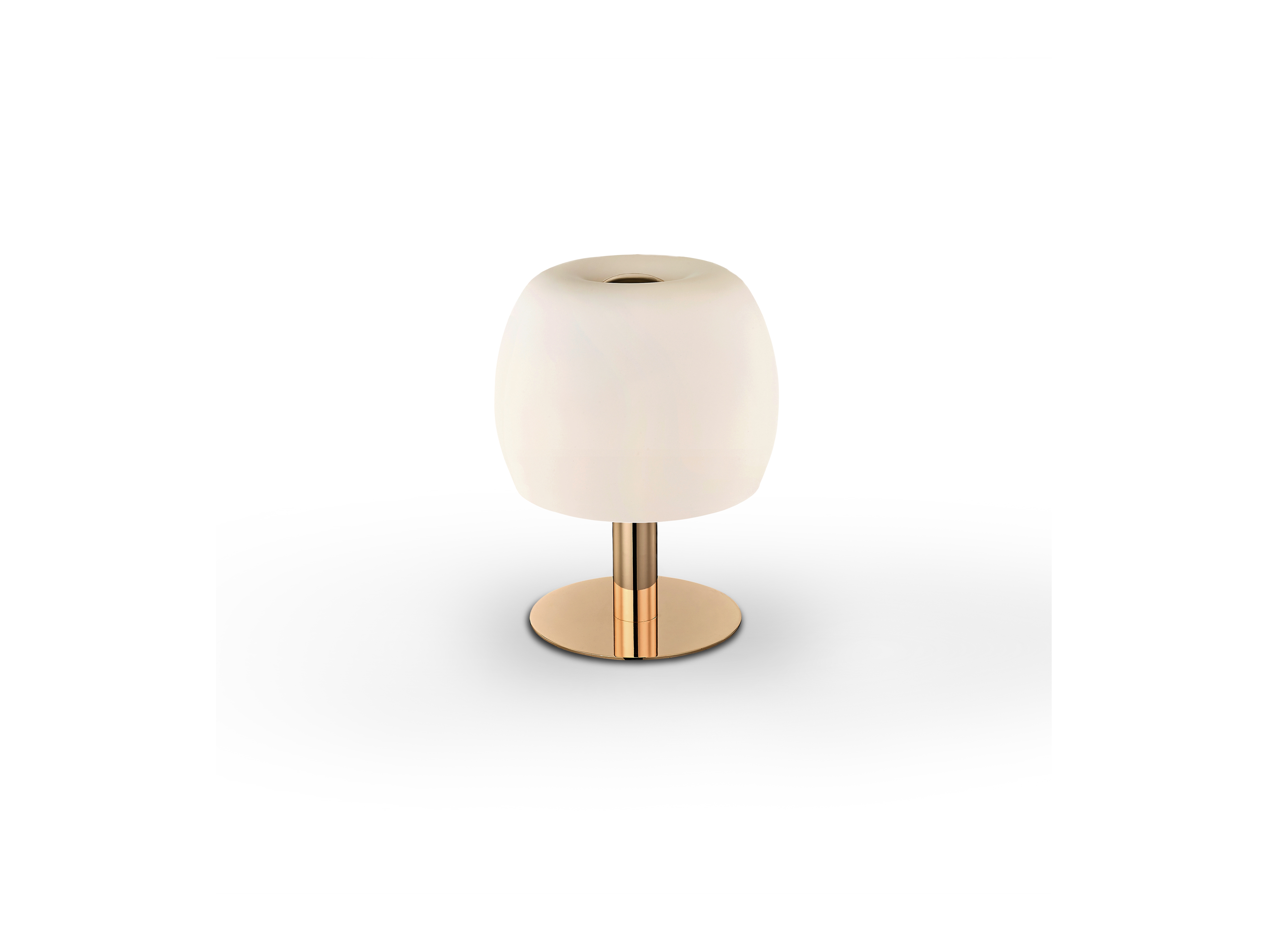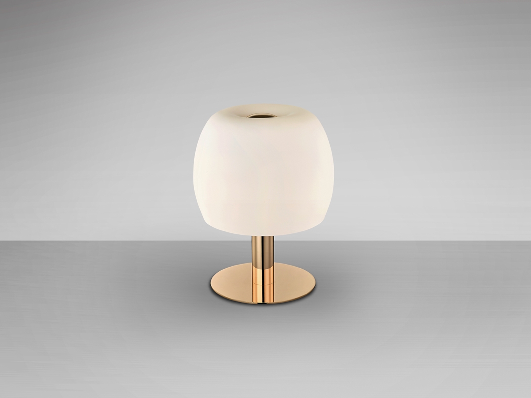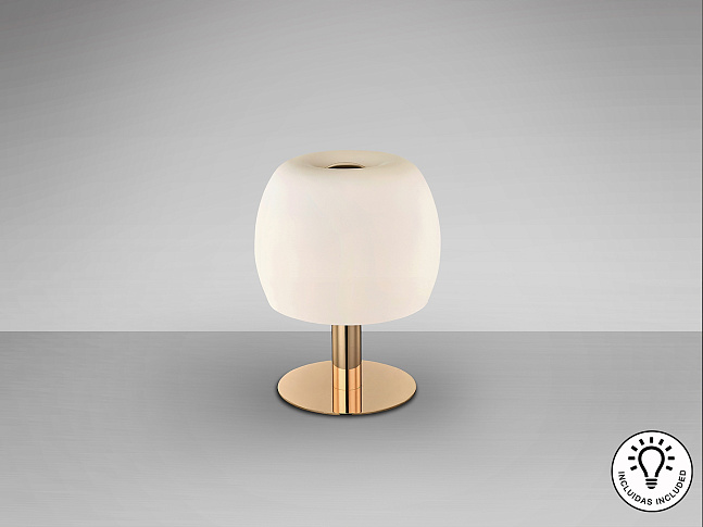 Настольная лампа из металла с блестящей золотой отделкой. Абажур из опалового стекла. ·В комплект входят 3 светодиода G9 мощностью 6 Вт.