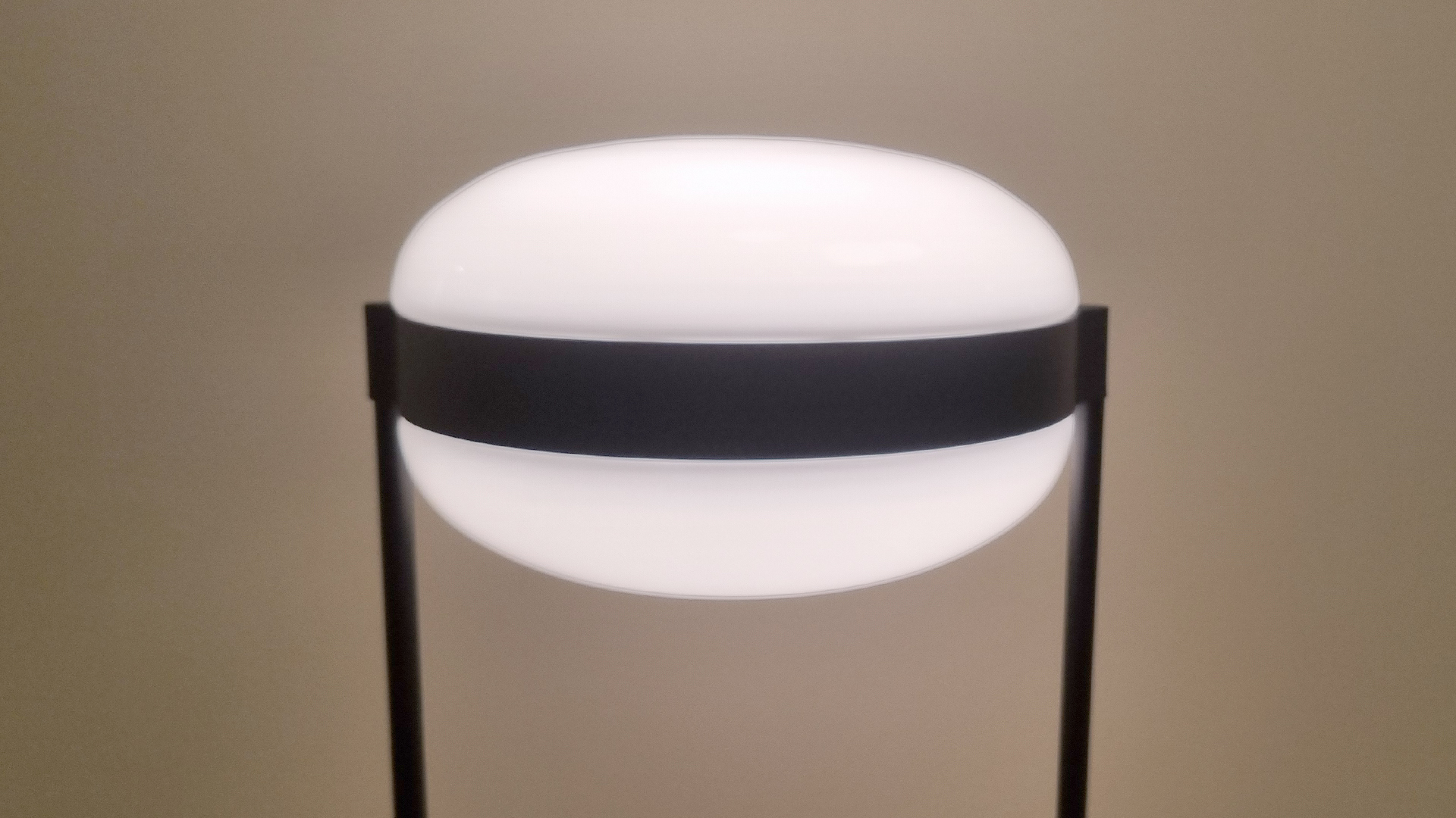 Beaded T — настольная лампа из алюминия и выдувного стекла. Двойной рассеиватель для прямого и непрямого света доступен в опалово-белом или дымчато-сером цвете; в последнем варианте используется плоский внутренний рассеиватель, чтобы не было видно источника света. Центральное алюминиевое кольцо имеет текстурированную матовую чёрную отделку.