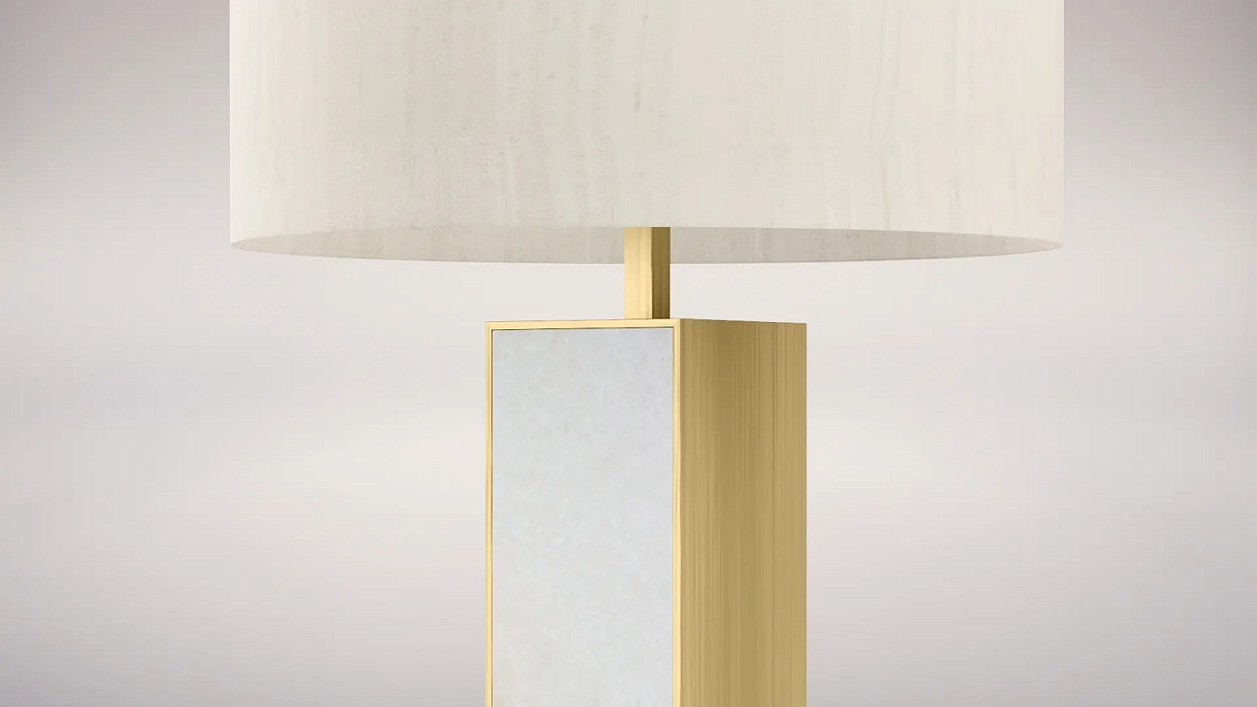Разноцветный камень придает динамизм латунному основанию настольной лампы BIARRITZ, увенчанному барабанным абажуром из текстурированного двойного шелка.