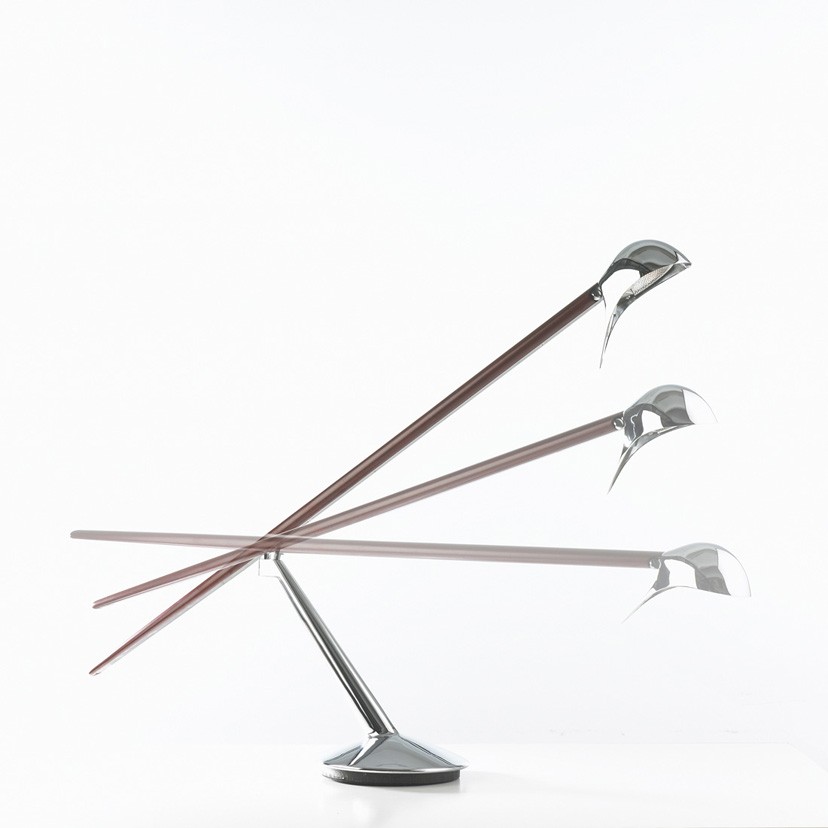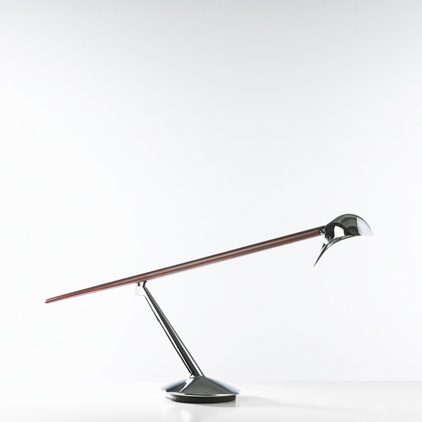 Регулируемая настольная лампа, конструкция из металла и дерева. Доступен в двух вариантах отделки: необработанный с натуральным дубом или блестящий хромированный металл в сочетании с натуральным матовым красным деревом. светодиоды.