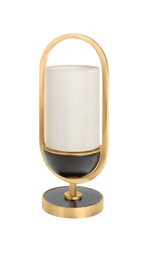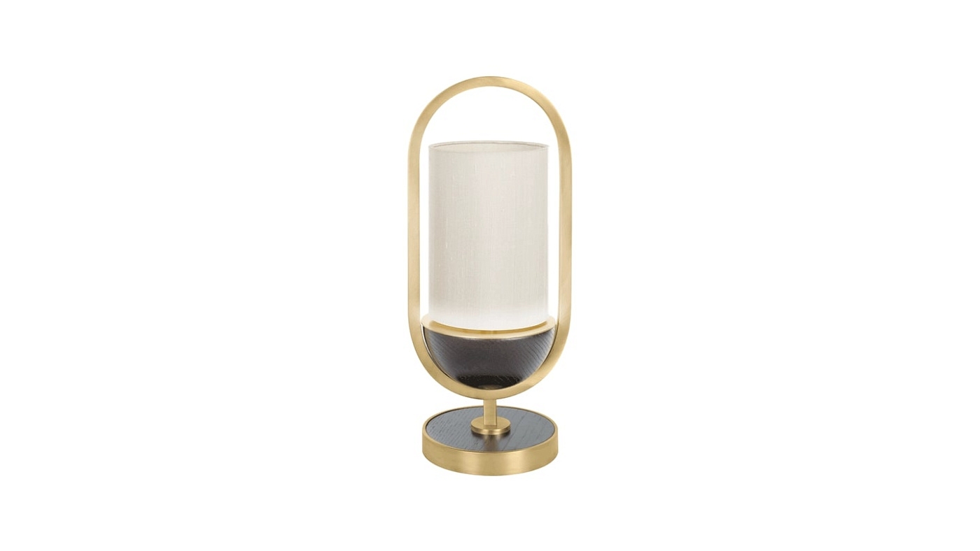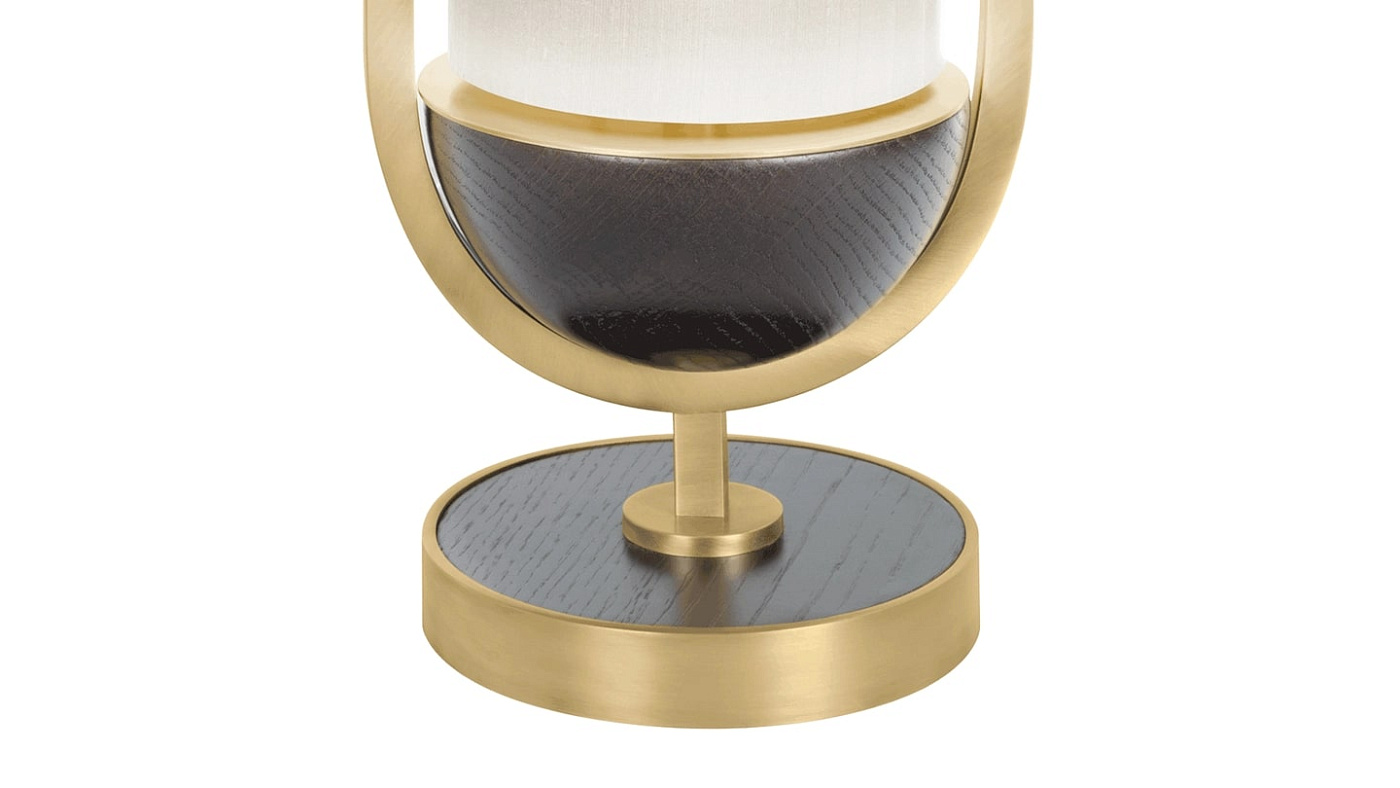 Двойной шелковый абажур настольной лампы BONN волшебным образом подвешен в ромбовидном каркасе из матовой латуни на подставке из цельного дерева.