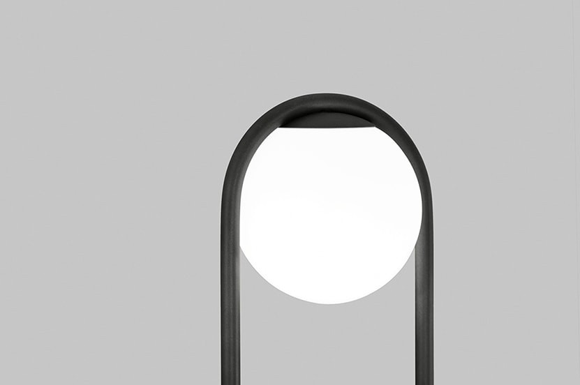 Настольная лампа состоит из опалового стеклянного шара и металлических деталей с отделкой из сатинированной латуни или черного матового цвета.
