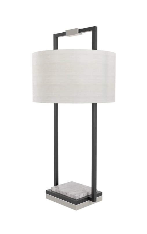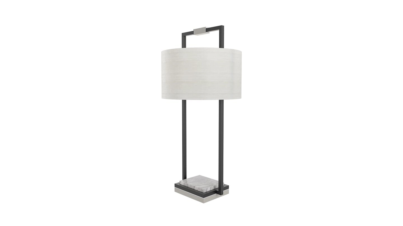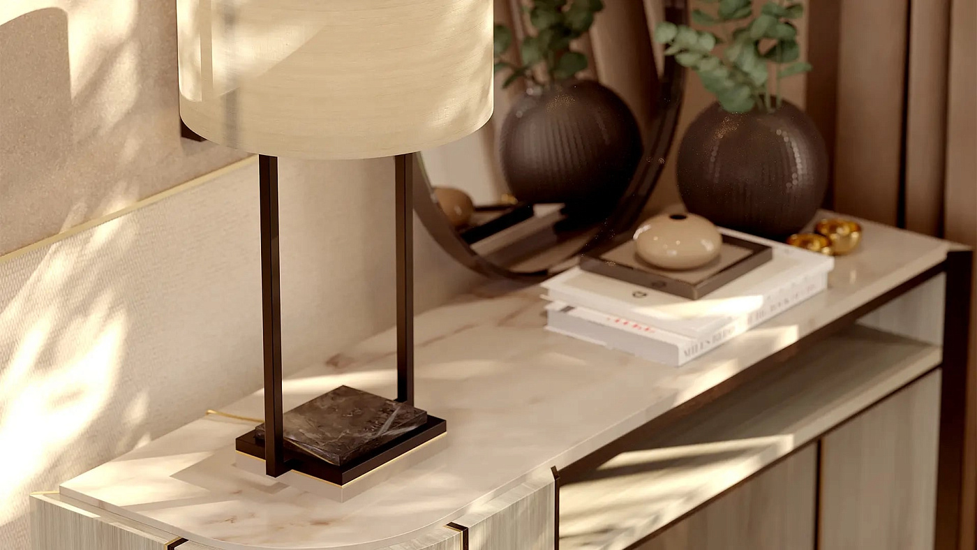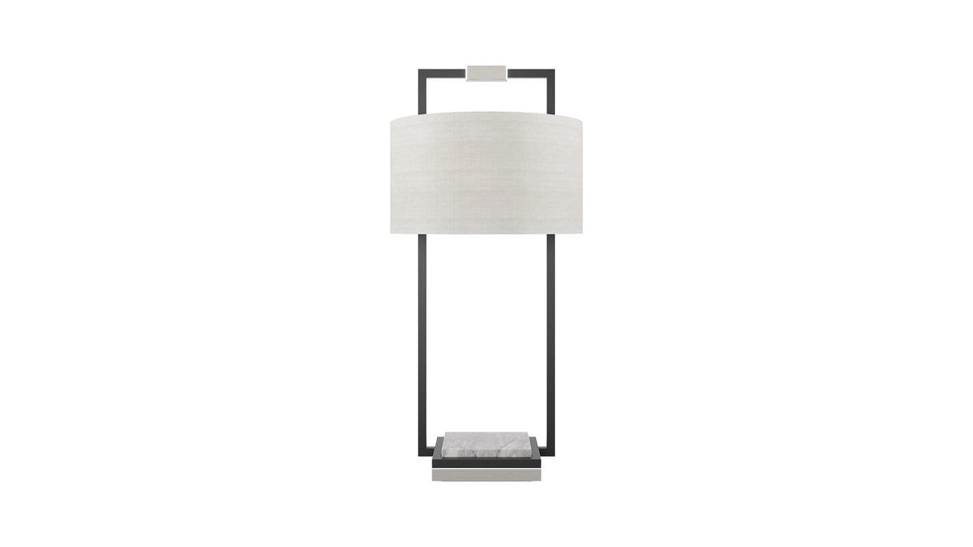 Настольная лампа CORFU, представляющая собой структурное сочетание нержавеющей стали, камня и лакированного дерева с тканевым абажуром, придает изысканному силуэту роскошную материальность.