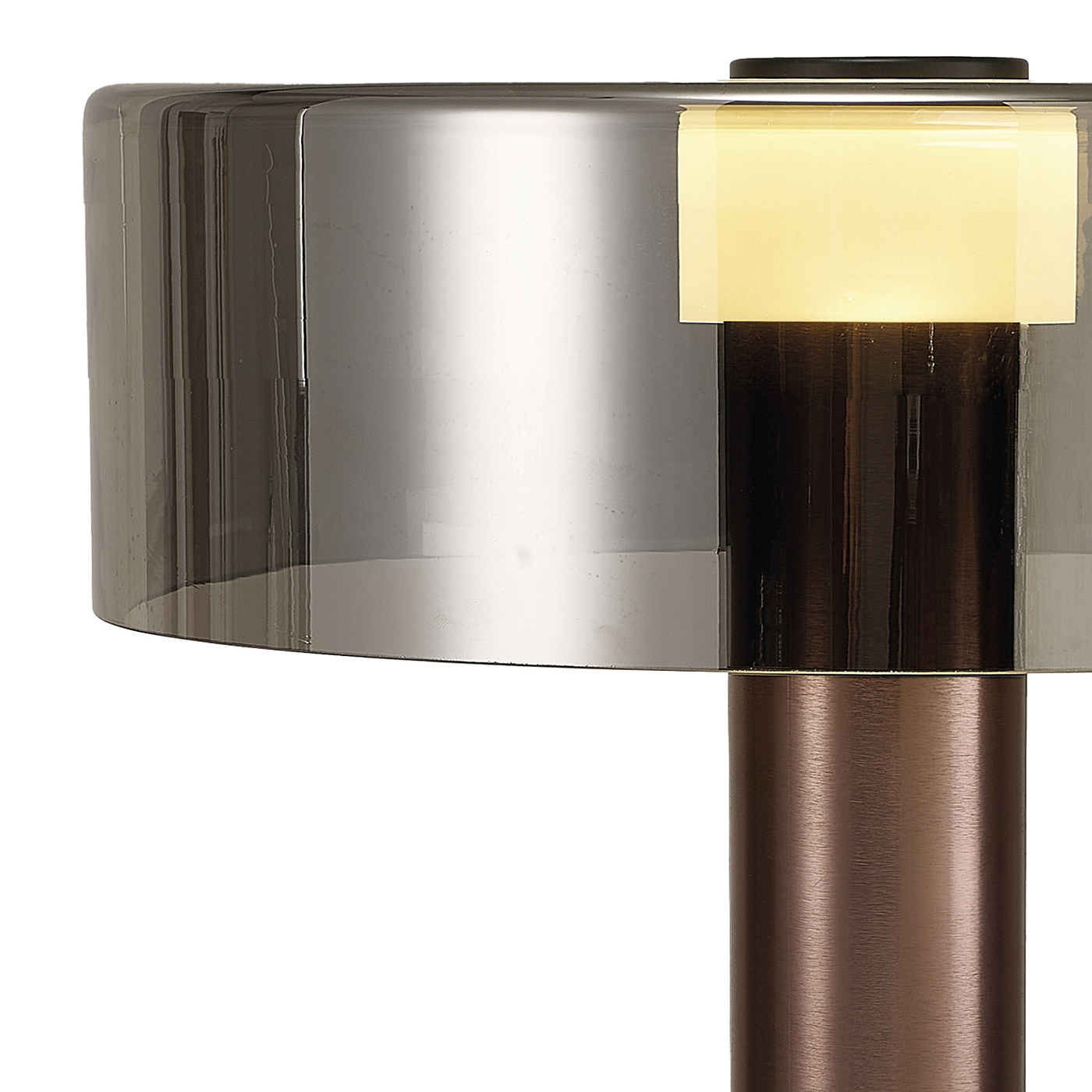 Серия светильников Gin собрала в своем образе все черты сдержанного мужского характера. Самодостаточный по формам, в основе которых лежат цилиндрические плафон, основание и ножка, он идеально вписывается в современные интерьерные пространства. Всегда дымчатая загадочность стеклянного абажура мягко рассеивает свет вокруг себя. Строгим разнообразием в дизайне являются лишь сближенные тонально цвета металлических элементов: полуматовый черный, благородный медный и платиновый. Рапорт из двух разных по размеру настольных ламп и подвеса идеален для гостиничных комплексов, спален, кабинетов и офисов.
