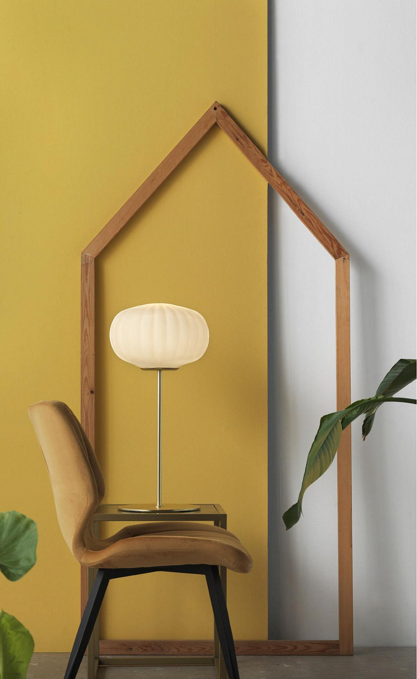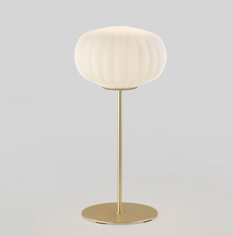 Настольная лампа с абажуром из опалового выдувного стекла и металлическим основанием в латунном, хромовом или черном цвете.
