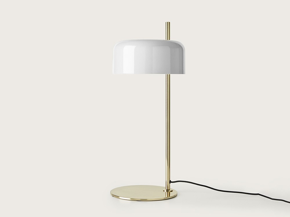 Настольная лампа полностью сделана из металла. Сталь окрашена в два цвета — абажур покрыт глянцевой белой краской, а стойка и основание золотой гальванической (для модели в наличии). Под заказ можно оформить лампу с белым абажуром и хромированной ножкой.