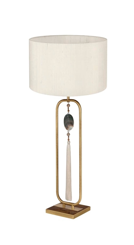 Хотите придать своему пространству интернациональный колорит? Гламурная настольная лампа LAOS сделает именно это. Изготовленный из деревянного шпона и матовой латуни, его двойной шелковый абажур при освещении подчеркивает декоративную подвеску с кисточками.
