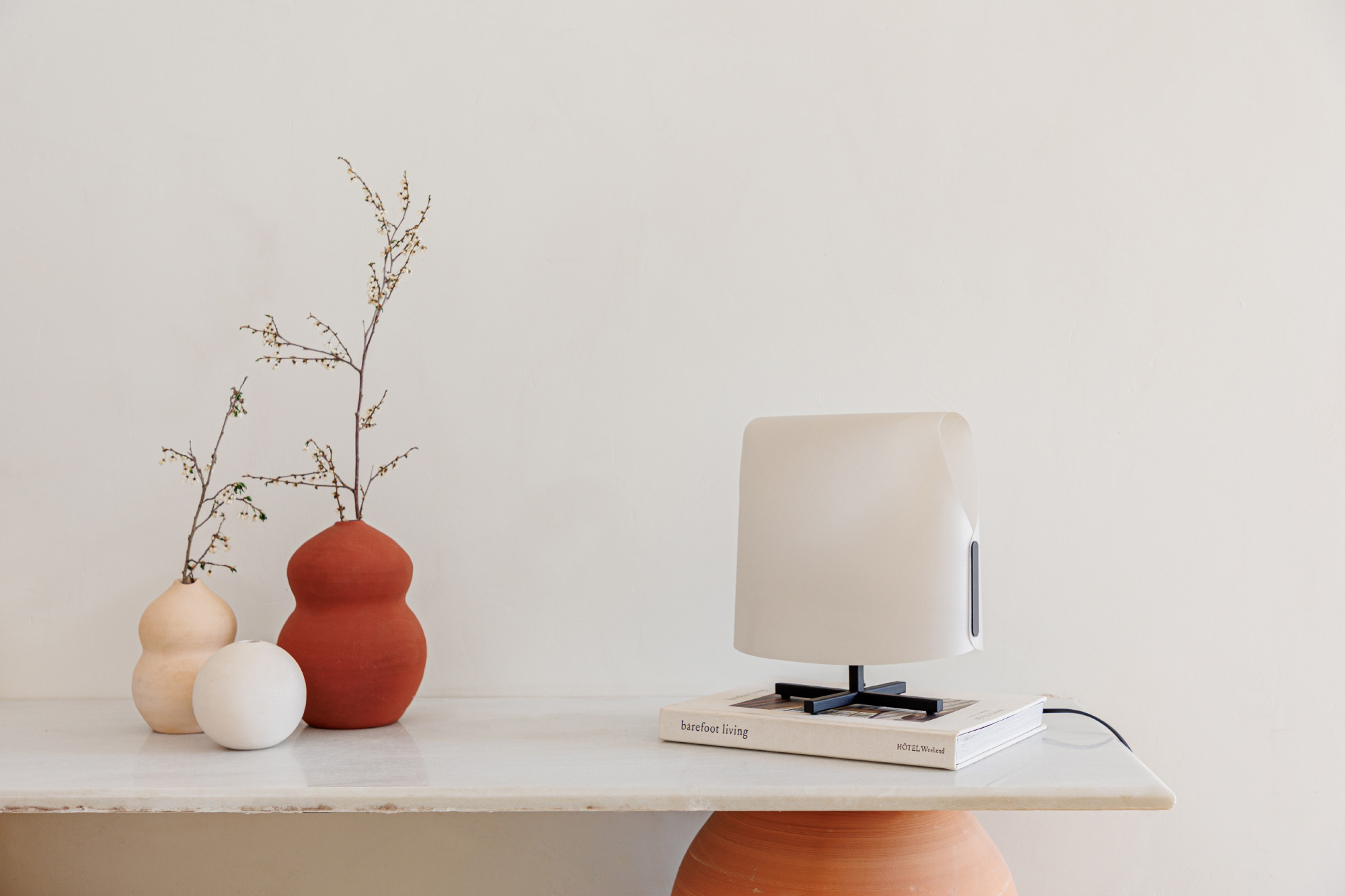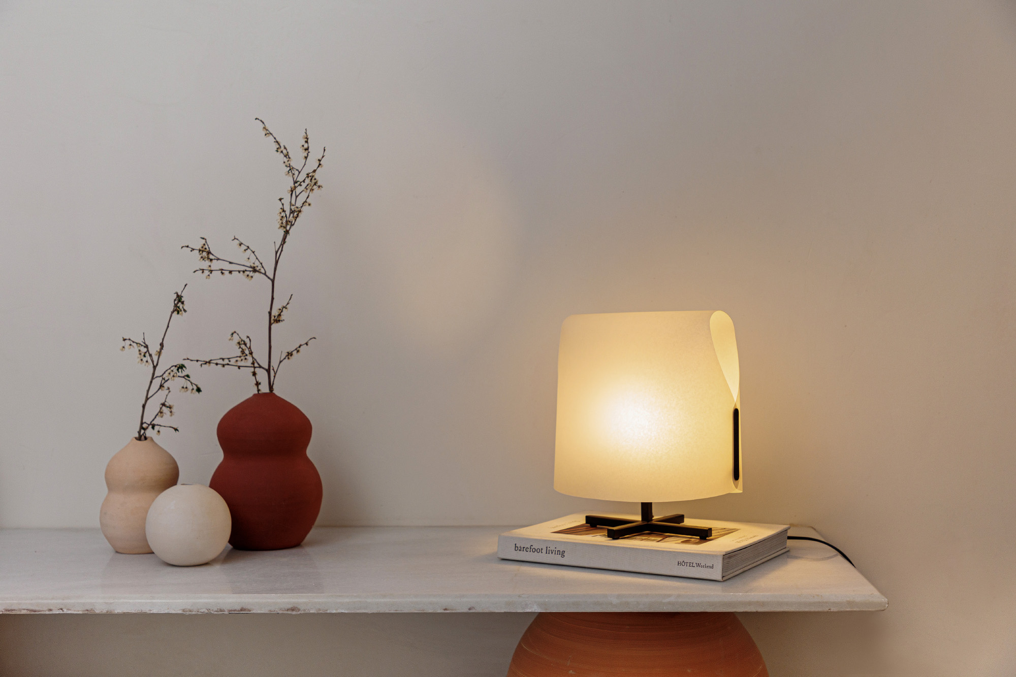 LUANG S — настольная лампа местного производства, разработанная Faro Lab. Семья Луанг вдохновляется искусством и предметами ручной работы, сделанными из папируса и натуральных волокон в Юго-Восточной Азии, а также тем, как они создают невероятно формальные поэтические и сложные объемные объекты из плоских элементов. Он имеет минималистскую структуру, которая резко контрастирует со свободным и органичным внешним видом его тени, которая, не имея структуры и материализуясь исключительно в папирусе, полностью светится. Оттенок этой модели бежевый, что обеспечивает очень естественный уютный свет.
