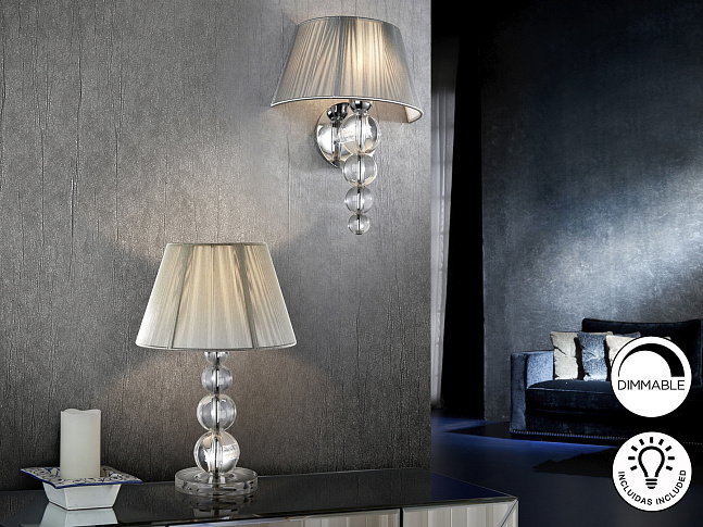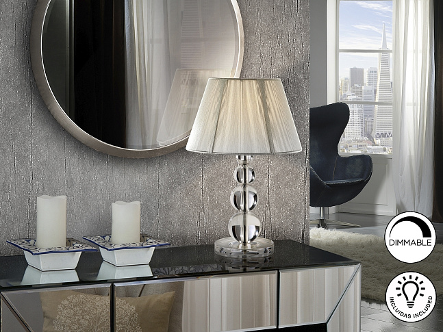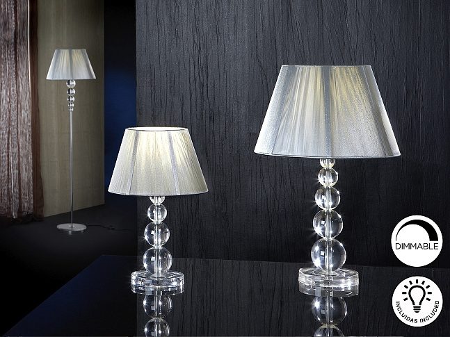 Настольная лампа маленькая из прозрачного метакрилата и металла с покрытием "блестящий хром", основание из прозрачного метакрилата, Абажур из натянутой проволоки серебристого цвета с внутренней подкладкой. Включает 1 светодиод E27 7 Вт. Диммируемый.