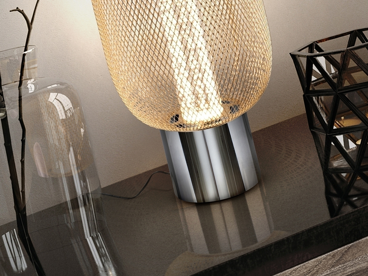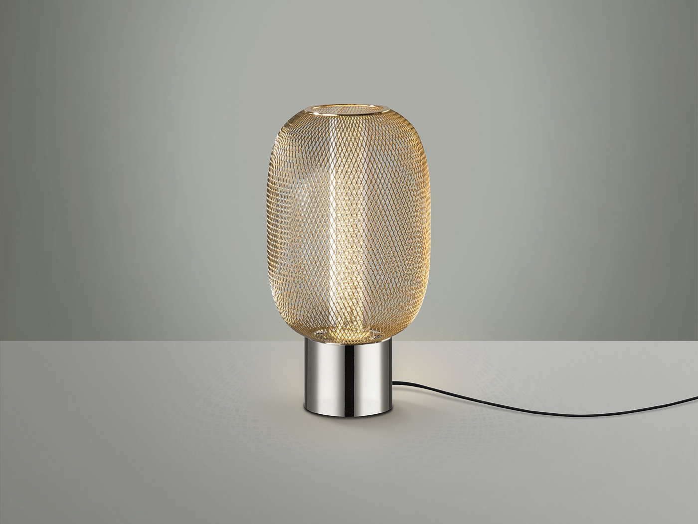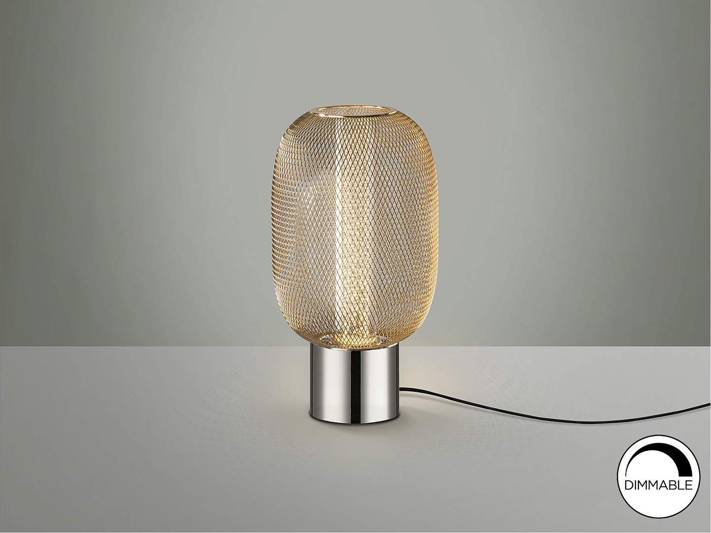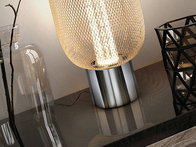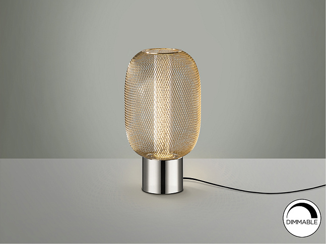 Настольная лампа на 1 лампу из хромированного металла. Двойной абажур с внутренним прозрачным акриловым цилиндром с пузырьками и внешним овалом из металлической сетки яркого золота. Светодиод 5 Вт, 450 лм, 3000 К. DIMMABLE.