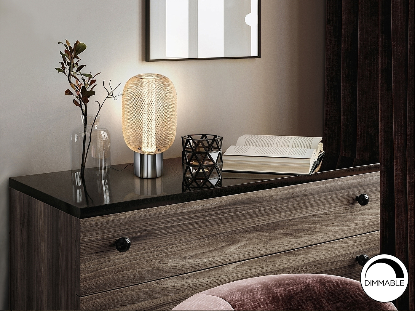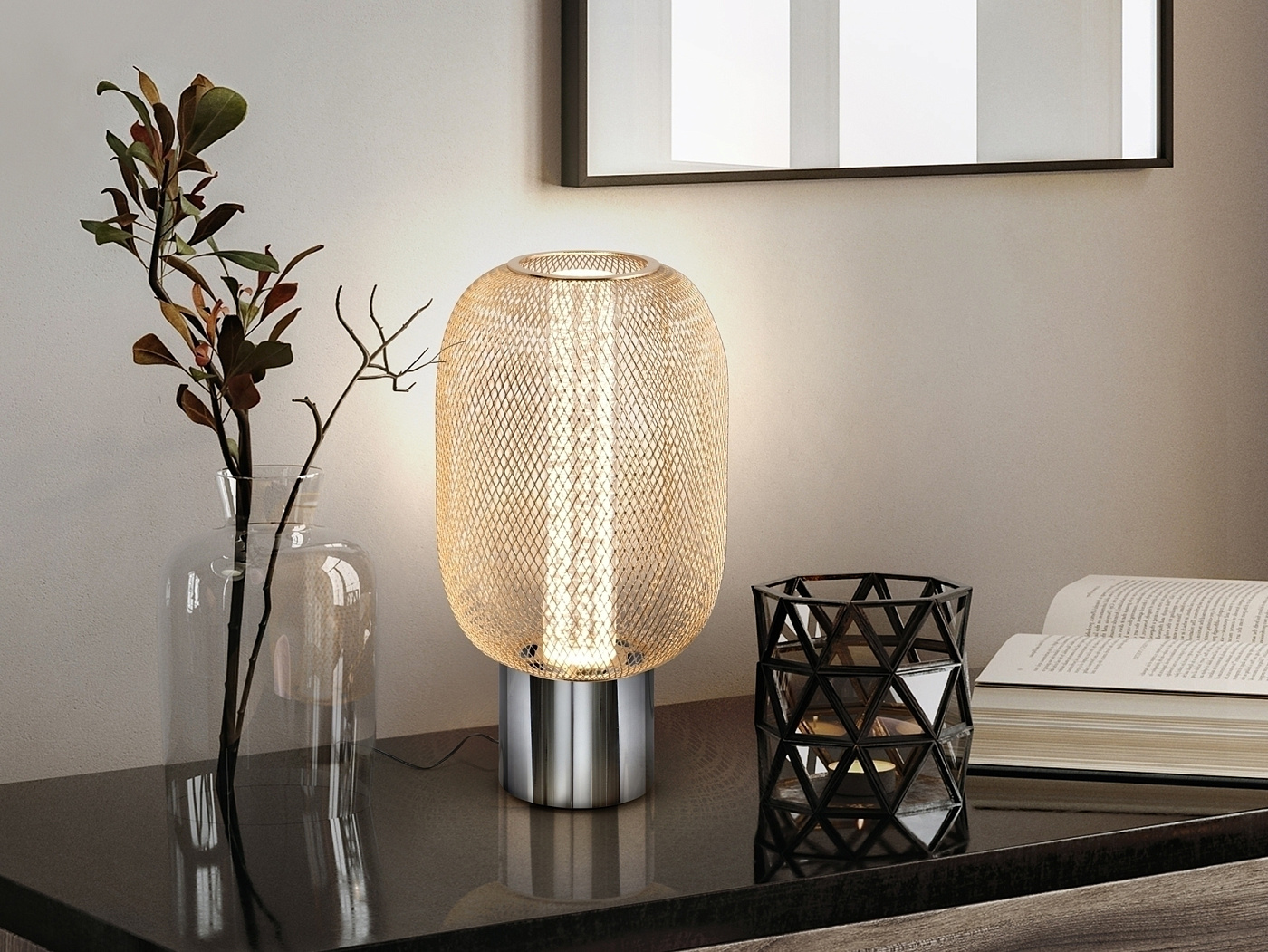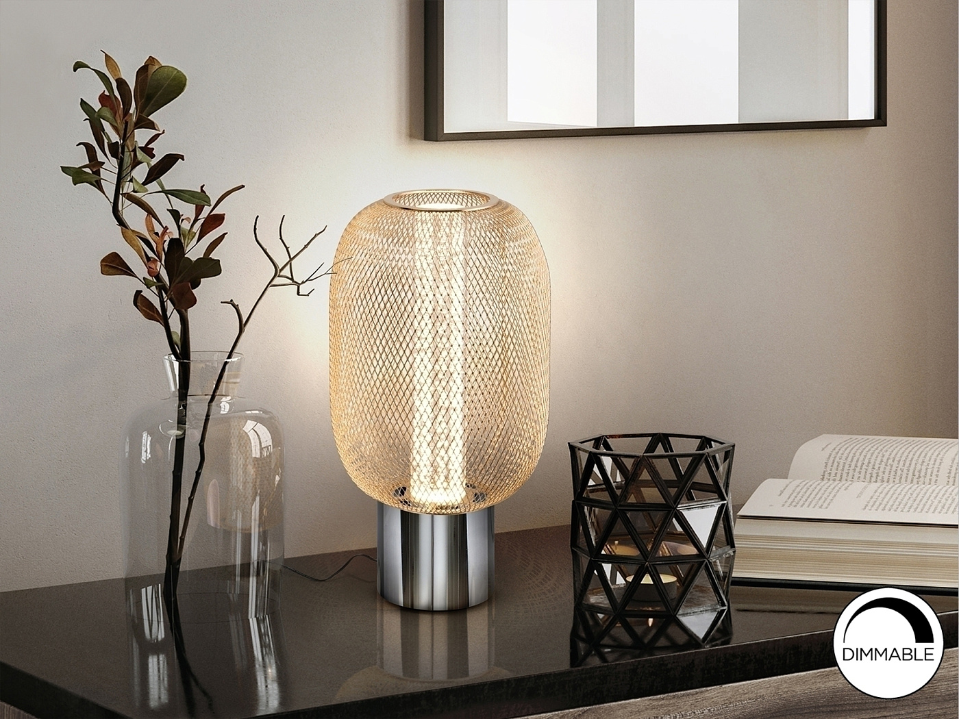Настольная лампа на 1 лампу из хромированного металла. Двойной абажур с внутренним прозрачным акриловым цилиндром с пузырьками и внешним овалом из металлической сетки яркого золота. Светодиод 5 Вт, 450 лм, 3000 К. DIMMABLE.