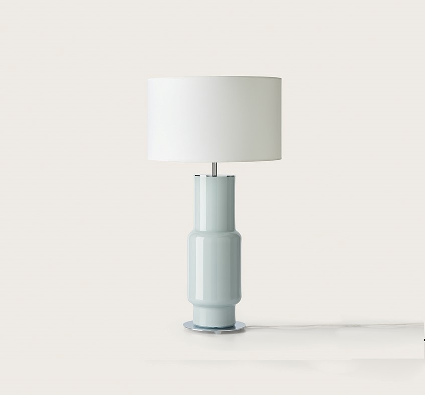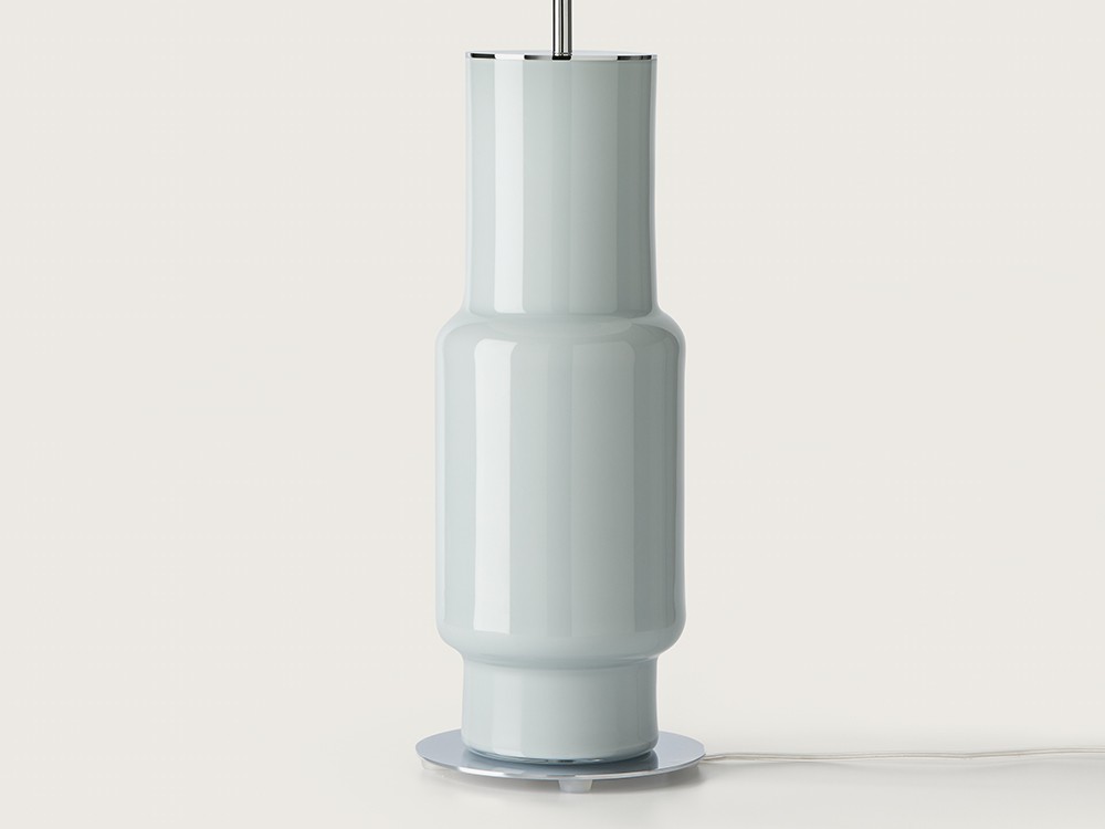 Дизайнерская настольная лампа со стальной конструкцией в золотом, хромированном, черном или белом исполнении и стеклянным основанием в цвете, который вы выбираете из представленной палитры.