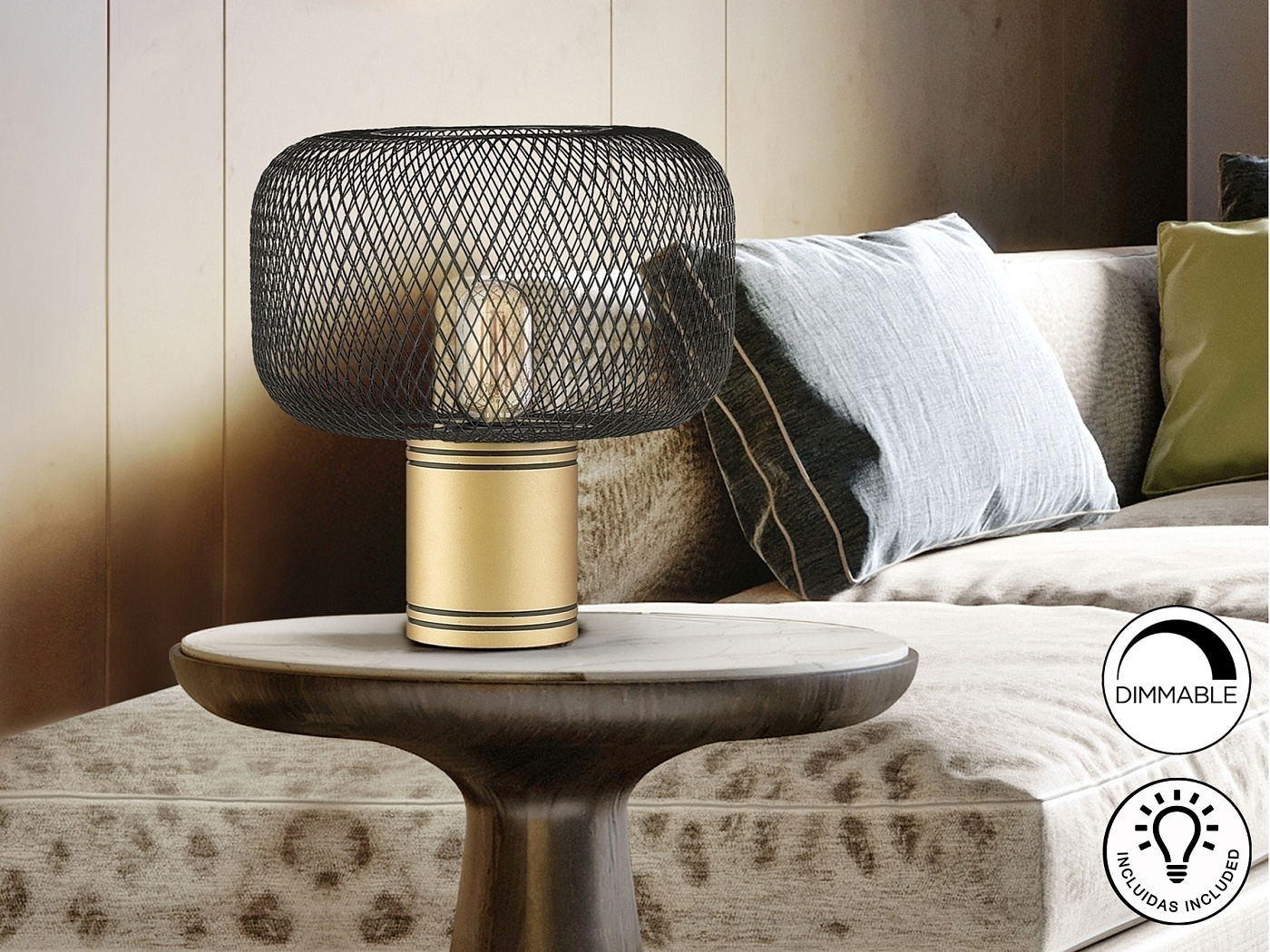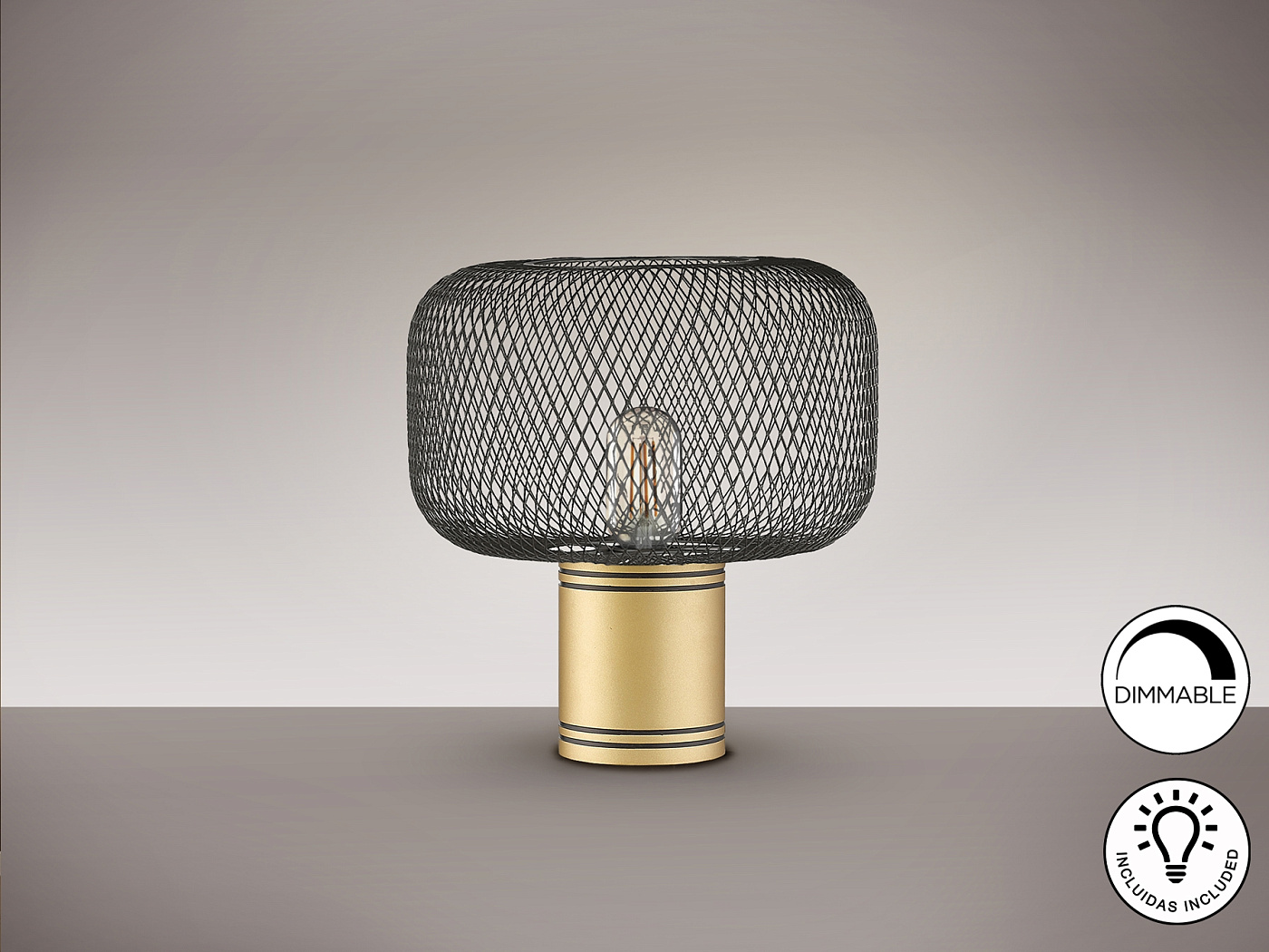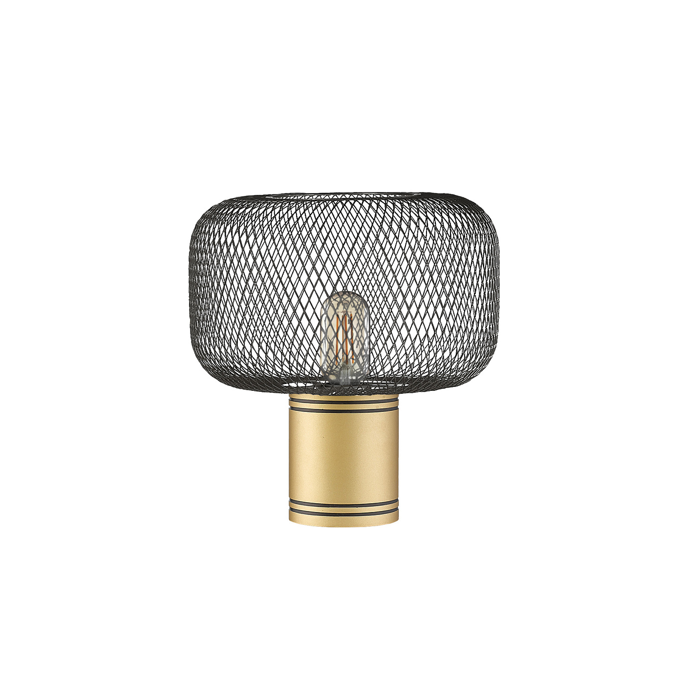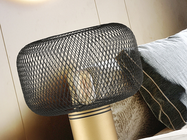 Настольная лампа на 1 лампочку из металла, окрашенного в золотистый цвет. Абажур из металлической сетки черного матового цвета. ·Этот товар включает в себя 1 светодиод E27 8 Вт.. DIMABLE.