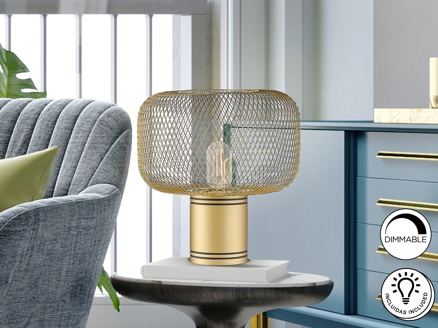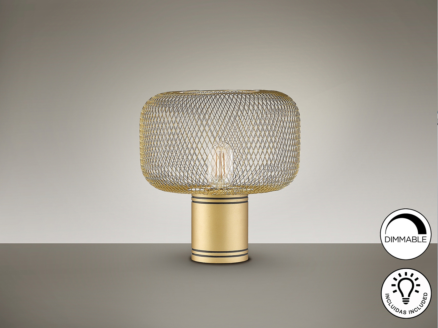 Настольная лампа на 1 лампочку из металла, с абажуром из металлической сетки, окрашена в золотой цвет. ·Этот товар включает в себя 1 светодиод E27 8 Вт. DIMABLE.