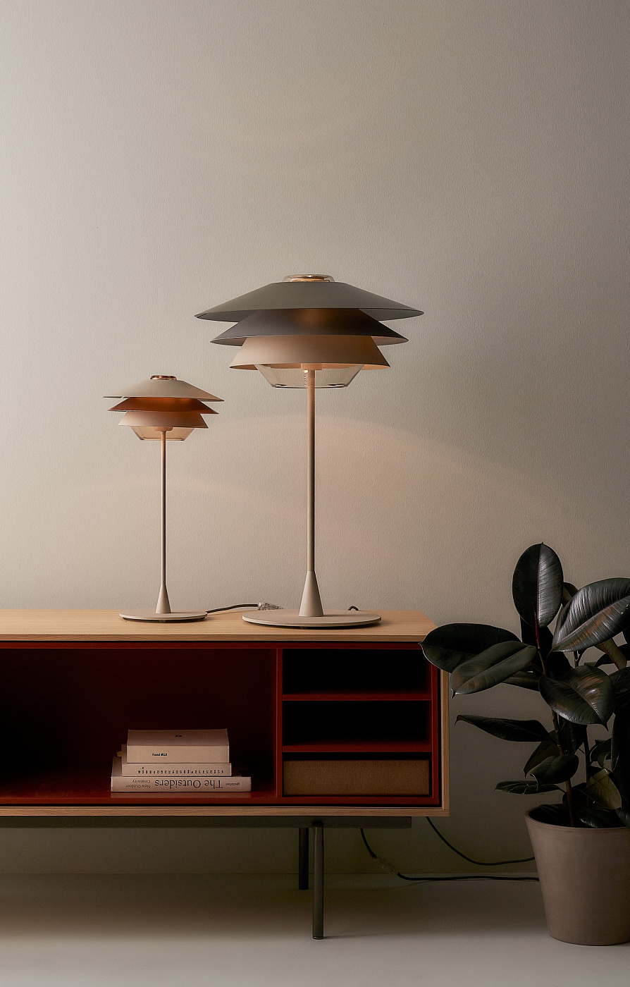 Настольная лампа из дутого стекла, оснащенная тремя съемными коническими отражателями, которые позволяют варьировать световой эффект в соответствии с потребностями пользователя. Стекло коньячного цвета сочетается с отражателями бежевого, медного, серо-бежевого и желтого матового цветов. Стекло с серой отделкой продается с отражателями бежевого, темно-синего и голубого цвета, все они матовые. Серый текстильный кабель.