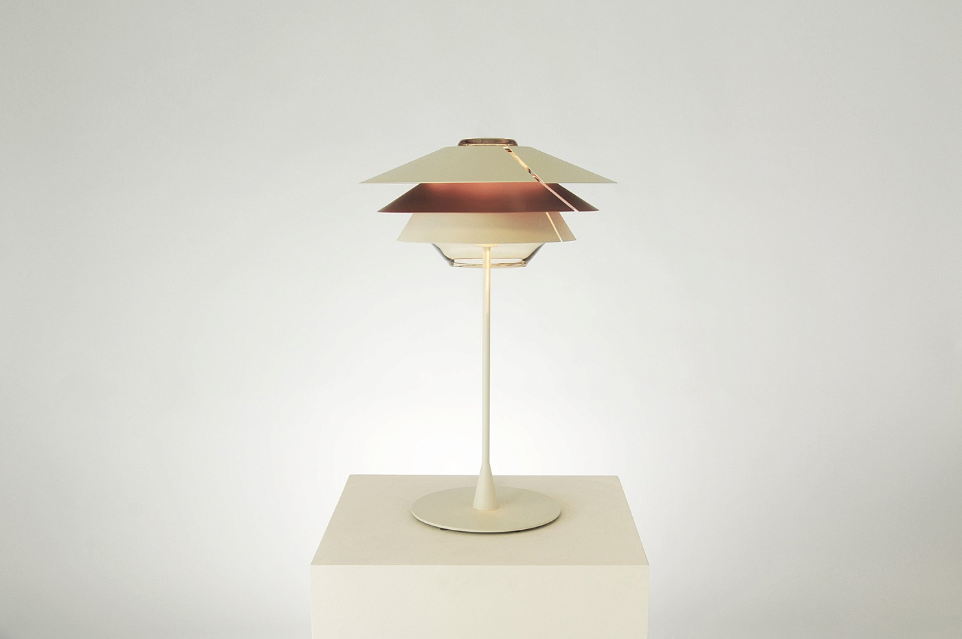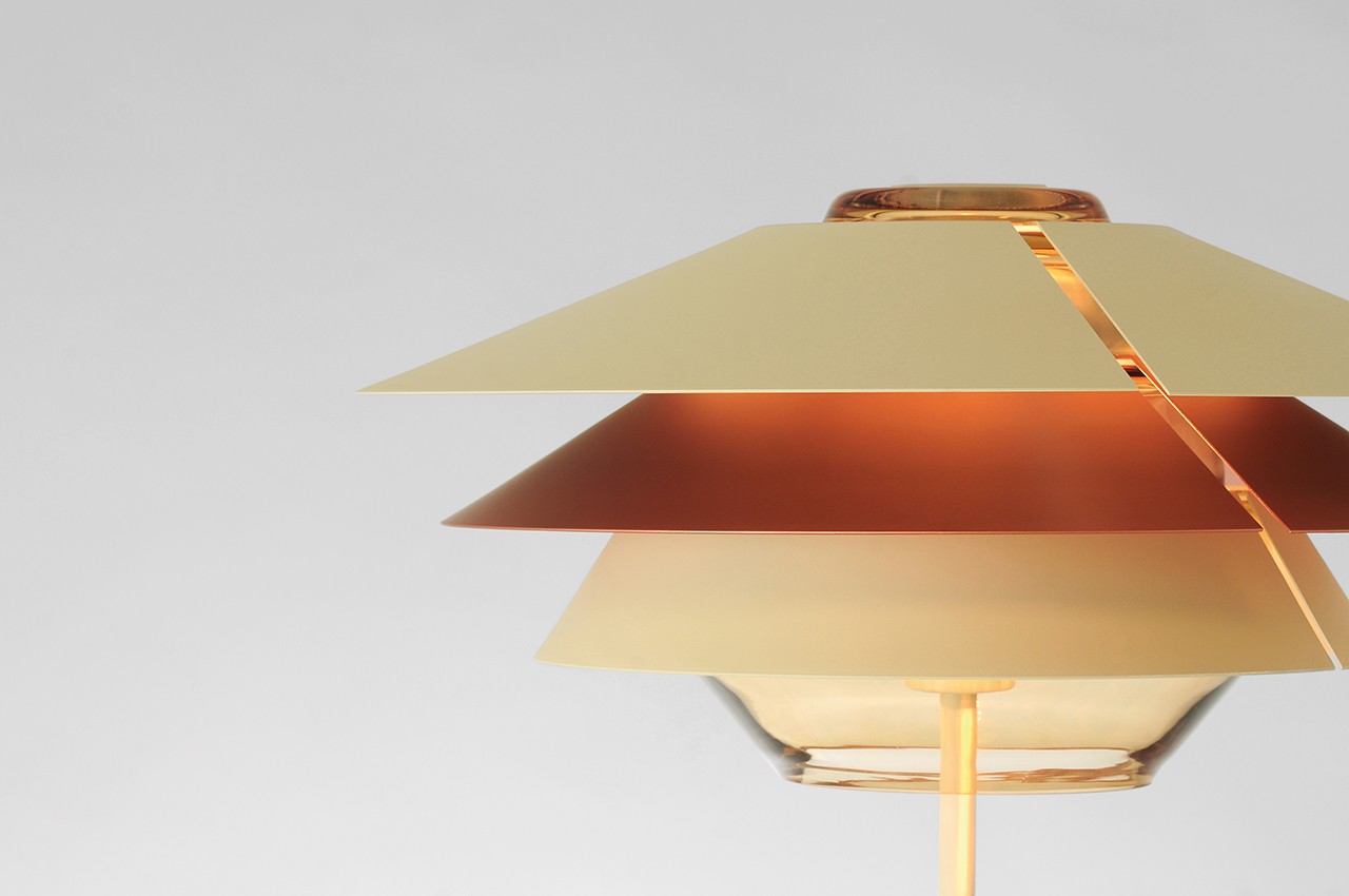 Настольная лампа из дутого стекла, оснащенная тремя съемными коническими отражателями, которые позволяют варьировать световой эффект в соответствии с потребностями пользователя. Стекло коньячного цвета сочетается с отражателями бежевого, медного, серо-бежевого и желтого матового цветов. Стекло с серой отделкой продается с отражателями бежевого, темно-синего и голубого цвета, все они матовые. Серый текстильный кабель.