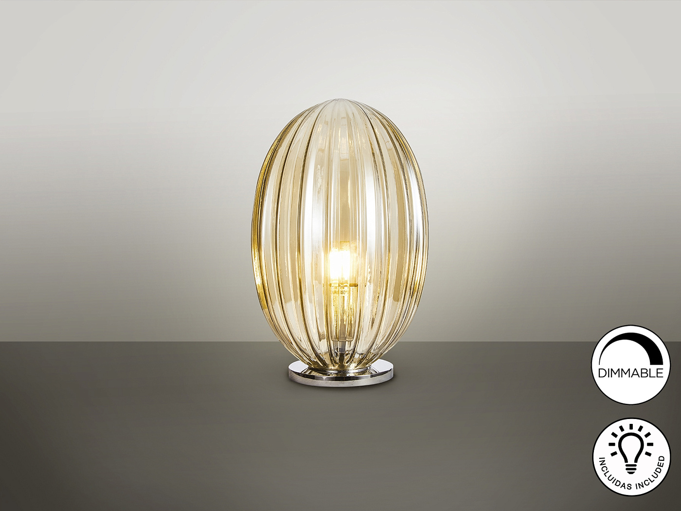 Настольная лампа на 1 лампу, изготовлена из металла, отделка хром. Небольшой стеклянный абажур, коньячный тон.