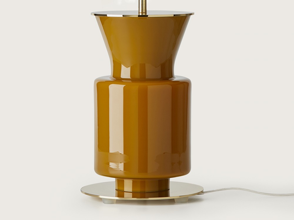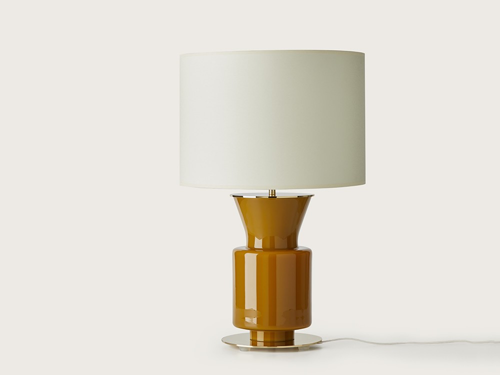 Дизайнерская настольная лампа со стальной конструкцией в золотом, хромированном, черном или белом исполнении и стеклянной вставкой любого цвета на выбор из цветовой таблицы, представленной на изображениях.