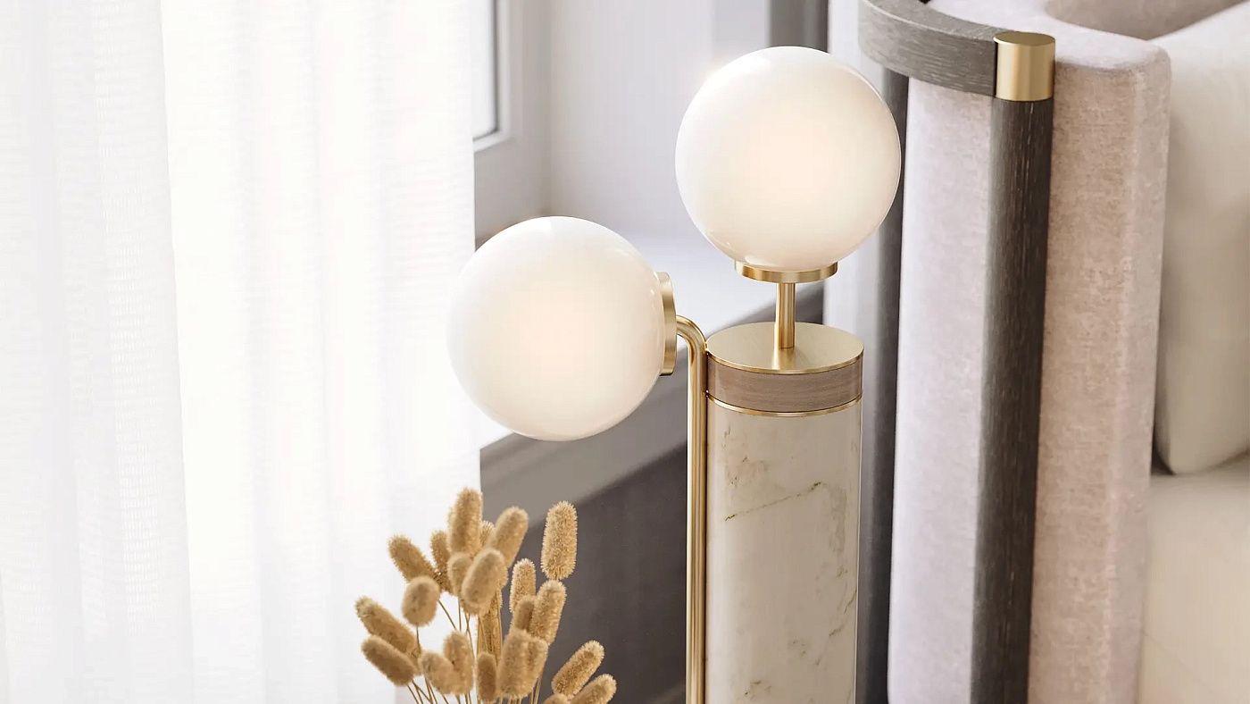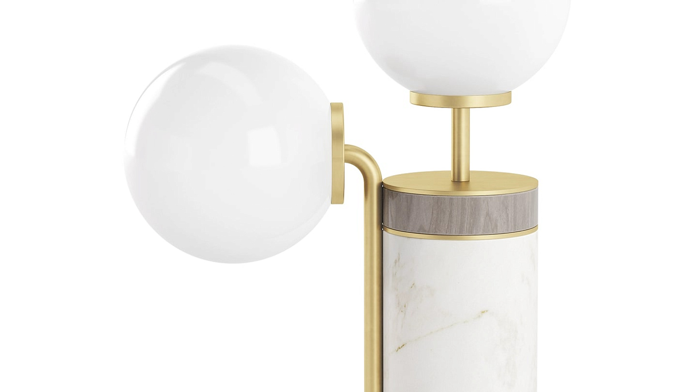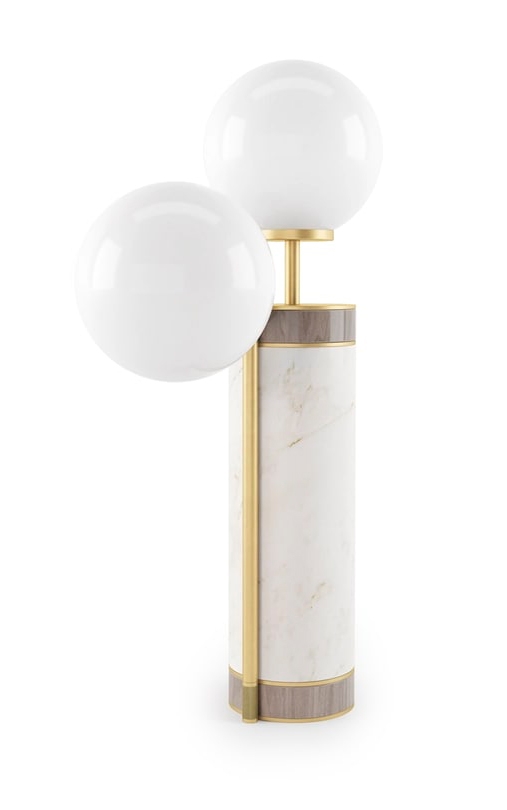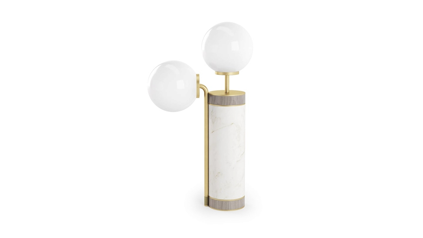"Настольная лампа PORTLAND, вдохновленная непринужденной атмосферой города Орегон, представляет собой мастер-класс по современной простоте. Два оттенка orb сочетаются с основой из дерева и камня, создавая интересную, но сдержанную отделку. "
