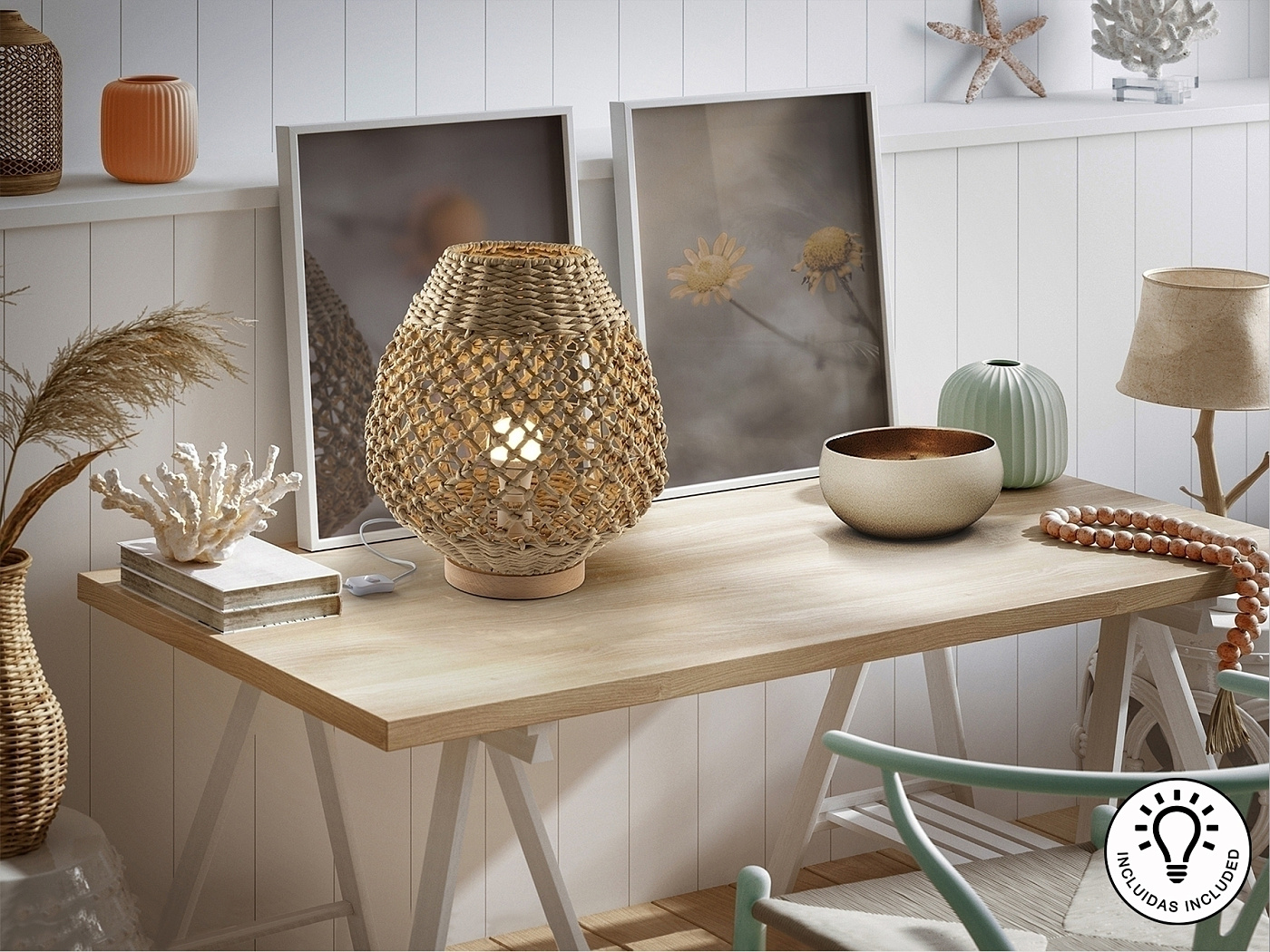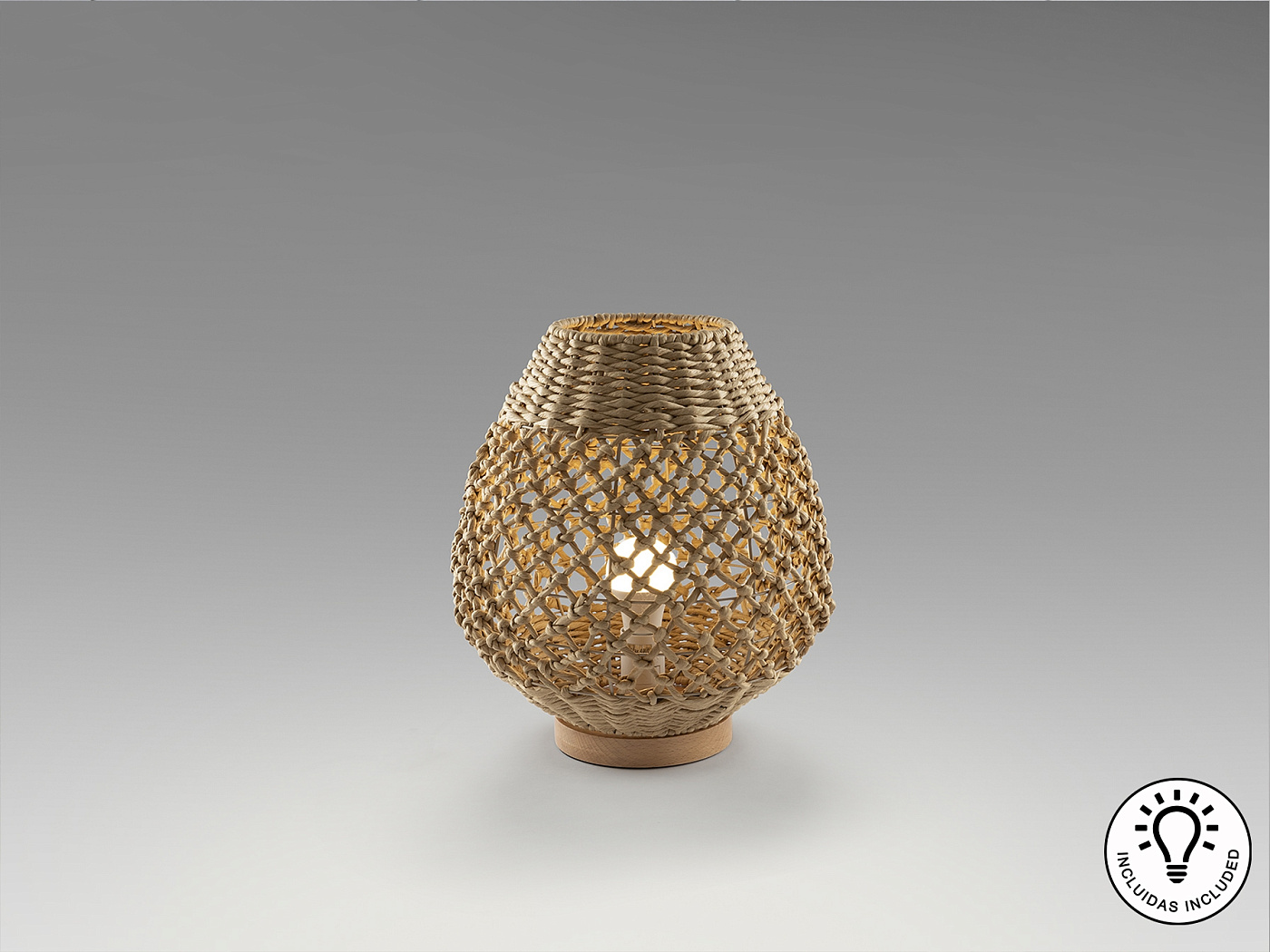 Большая настольная лампа на 1 лампу из металла и дерева, с абажуром из плетеных бумажных веревок с бежевой отделкой. ·В комплект входит 1 светодиод E27 мощностью 10 Вт.