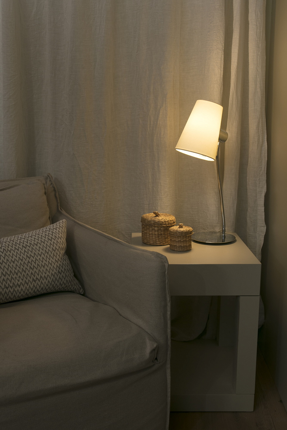 Изящно изогнутая ножка Lupe изготовлена из стали, абажур универсальной формы выполнен из ткани. Обратите внимание на то, как элегантно дизайнер решил переход между функциональными элементами светильника.
