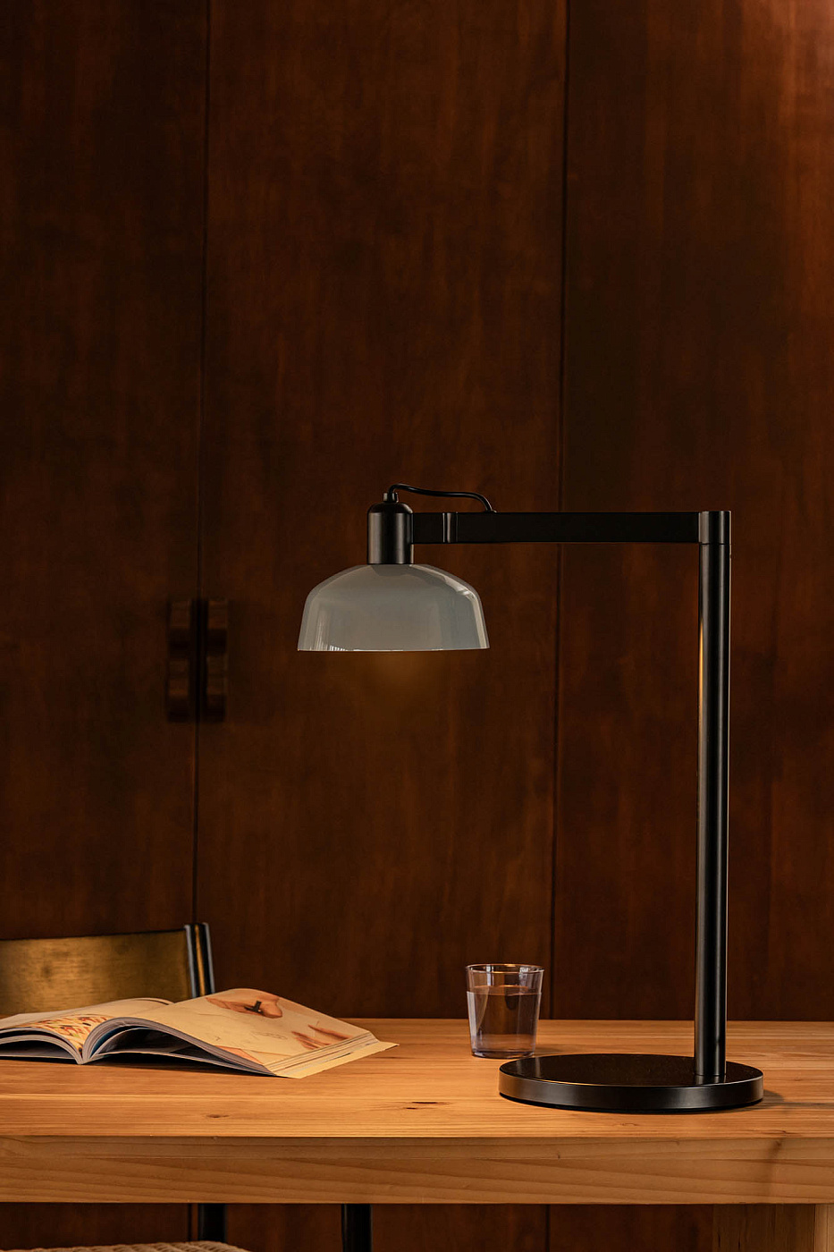 TATAWIN — это серия светильников, разработанная Адольфо Абейоном. Форма абажура напоминает верхнюю часть характерных домов Татауина, города, расположенного на юго-востоке Туниса. Этот светильник с черной конструкцией состоит из серо-голубого металлического абажура, который обеспечивает направленный свет.