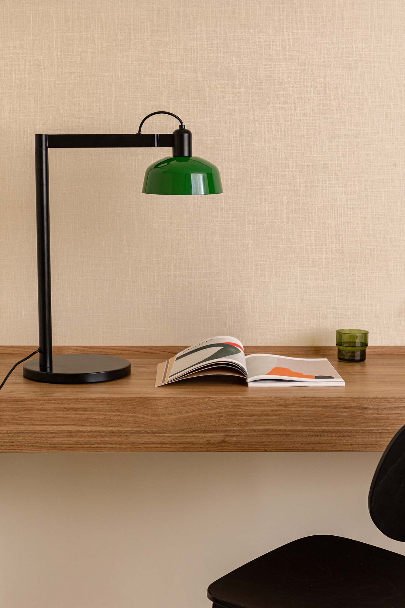 TATAWIN — это серия светильников, разработанная Адольфо Абейоном. Форма абажура напоминает верхнюю часть характерных домов Татауина, города, расположенного на юго-востоке Туниса. Этот светильник с черной конструкцией состоит из зеленого металлического абажура, который обеспечивает направленный свет.