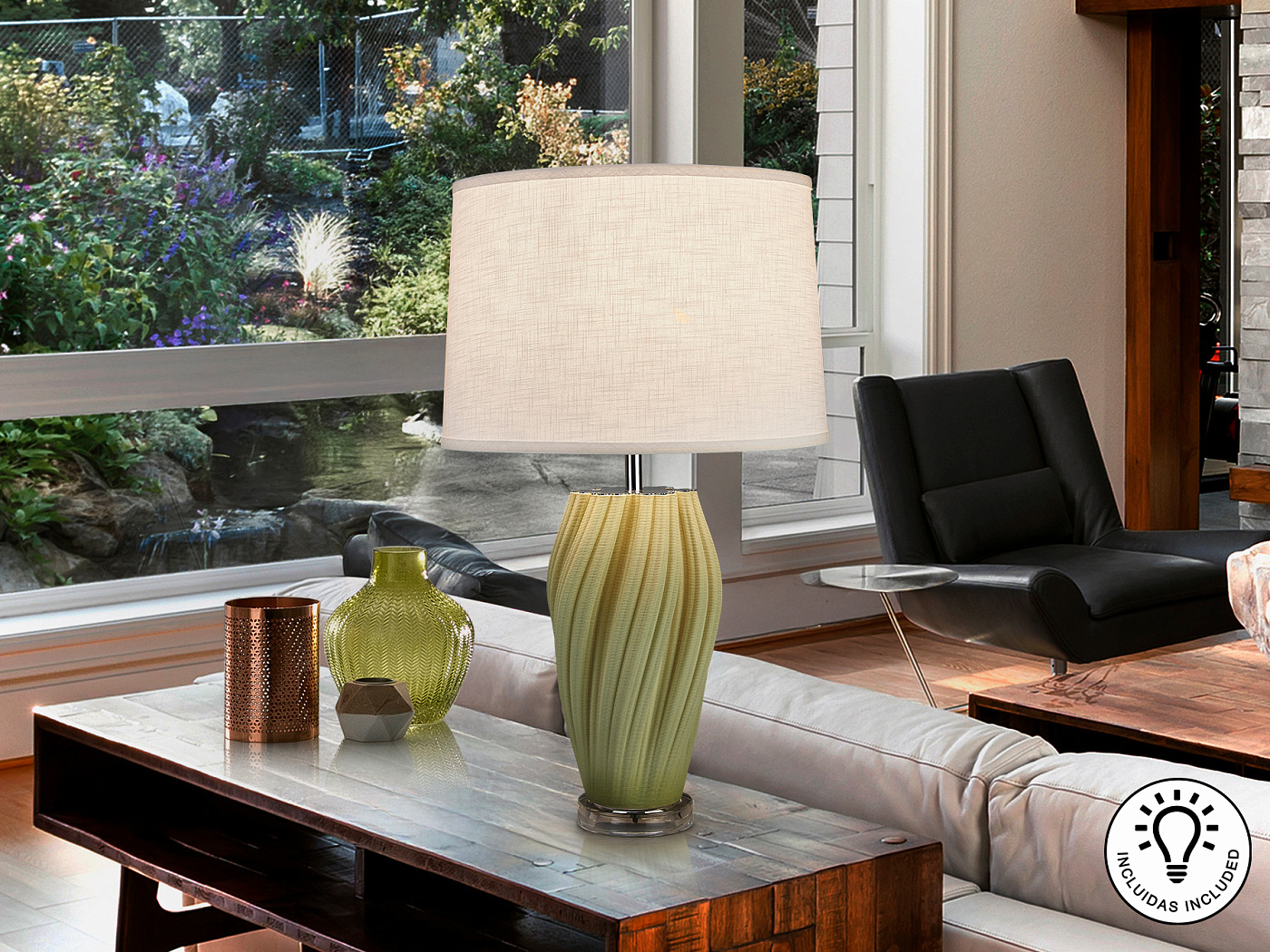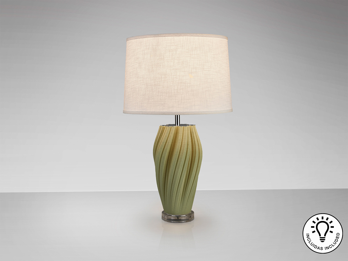 Настольная лампа на 1 лампу. Изготовлена из 3D-печатной керамики светло-зелёного цвета и хромированного металла. Абажур из белой ткани. ·В комплект входит 1 светодиод E27 мощностью 10 Вт.