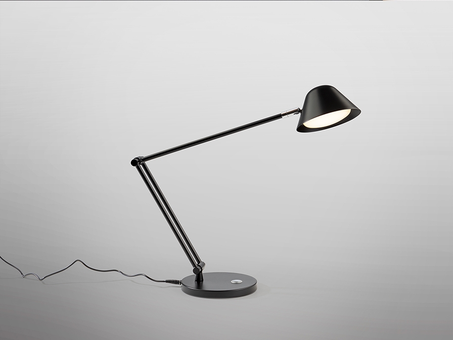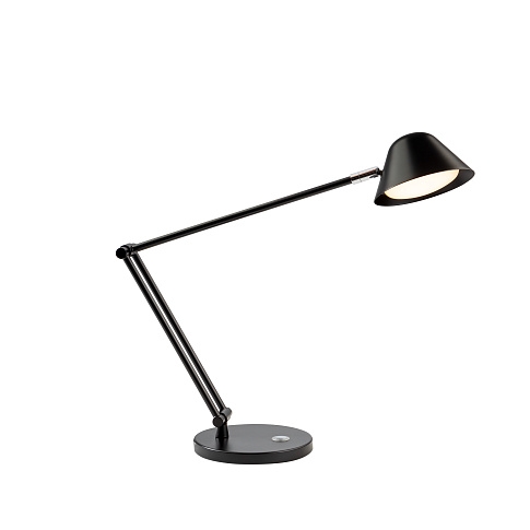 Настольная лампа с шарнирным кронштейном, изготовлена из металла и алюминия, матово-черная отделка. Тактильная кнопка. Регулируемый свет, регулируемая цветовая температура. Светодиод 10 Вт, 900 лм, CCT 3000-6500K
