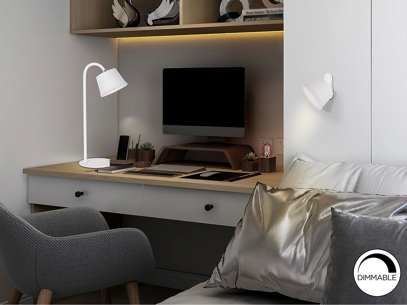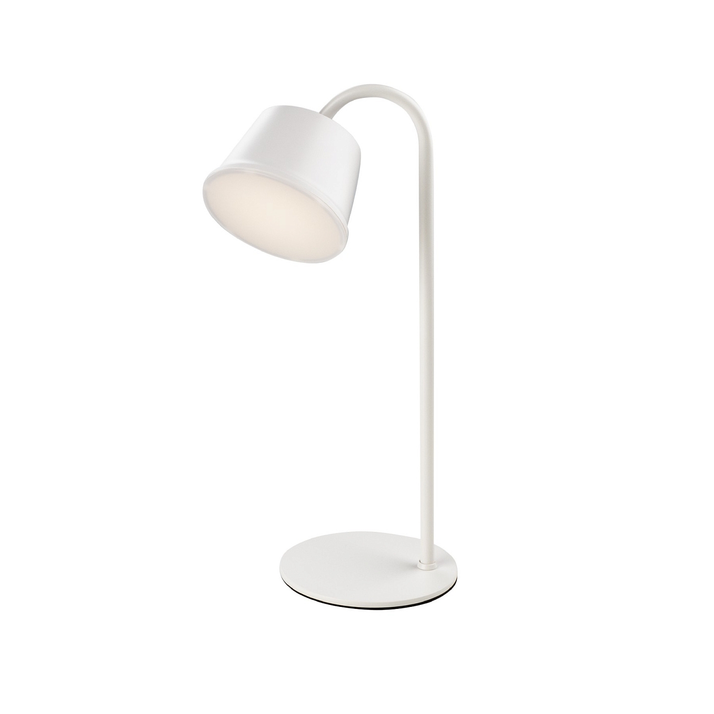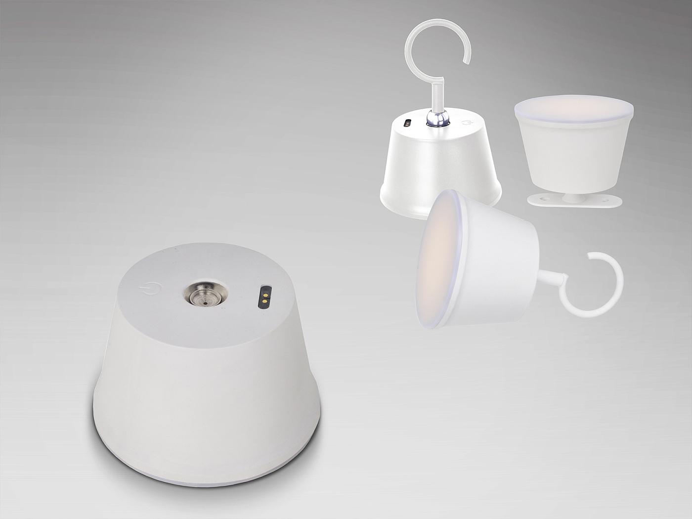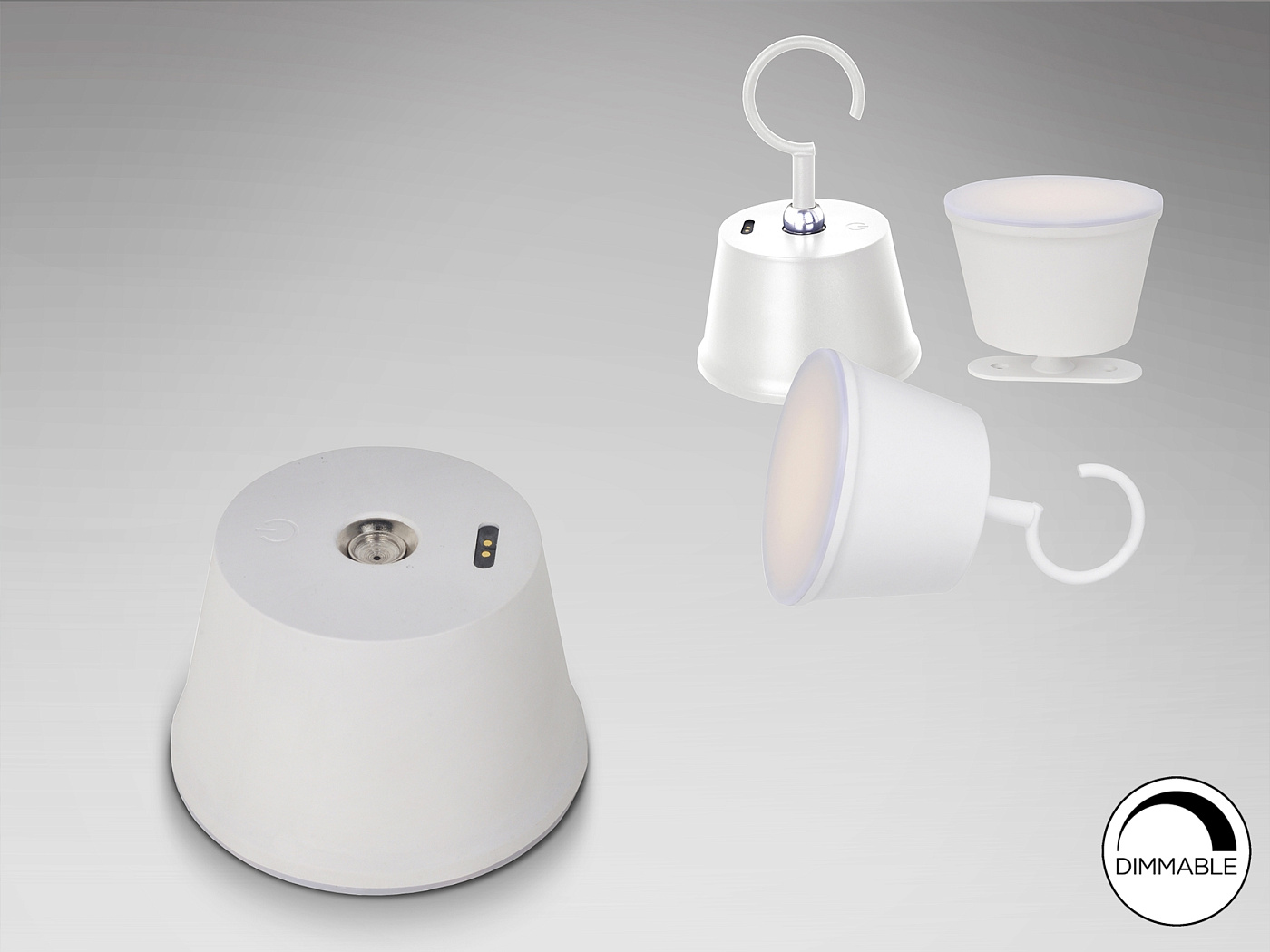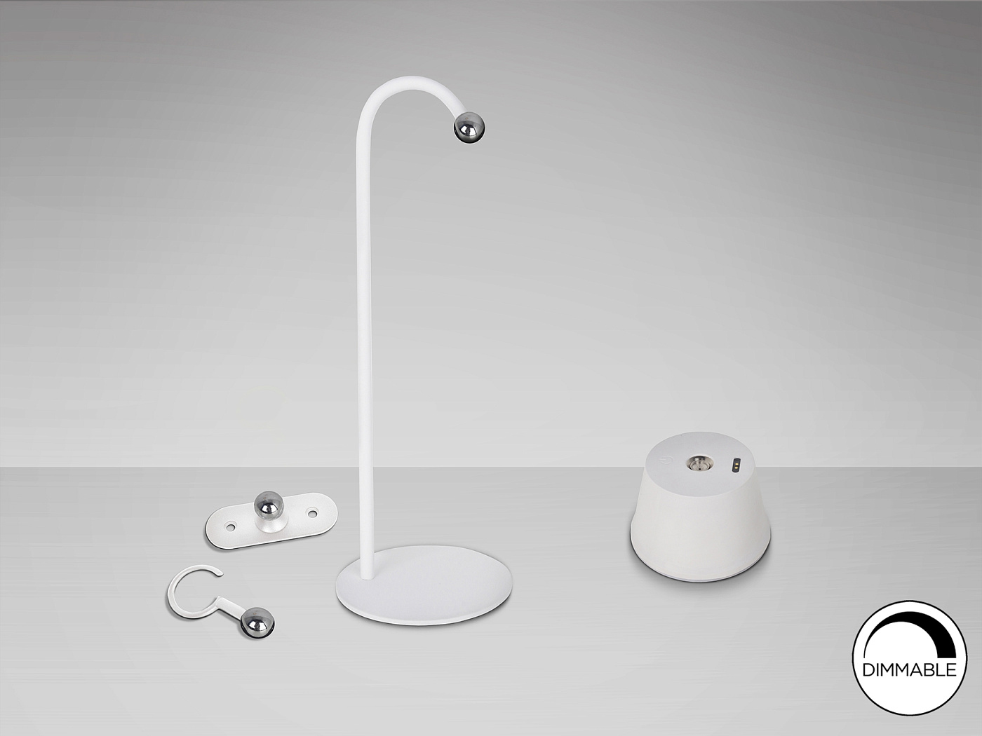 Светодиодная настольная лампа для внутреннего и наружного освещения включает магнитные аксессуары для использования в качестве настенного или подвесного светильника. Изготовлен из металла белого цвета и опалового акрила. Рассеиватель. Аккумулятор. Светодиод 3Вт, 200лм, 3000К. ДИММИРУЕМАЯ. IP54. Перезаряжаемая литиевая батарея, 3000 мАч. Время зарядки 5 часов, примерная автономность 6 часов. Зарядное устройство в комплекте.