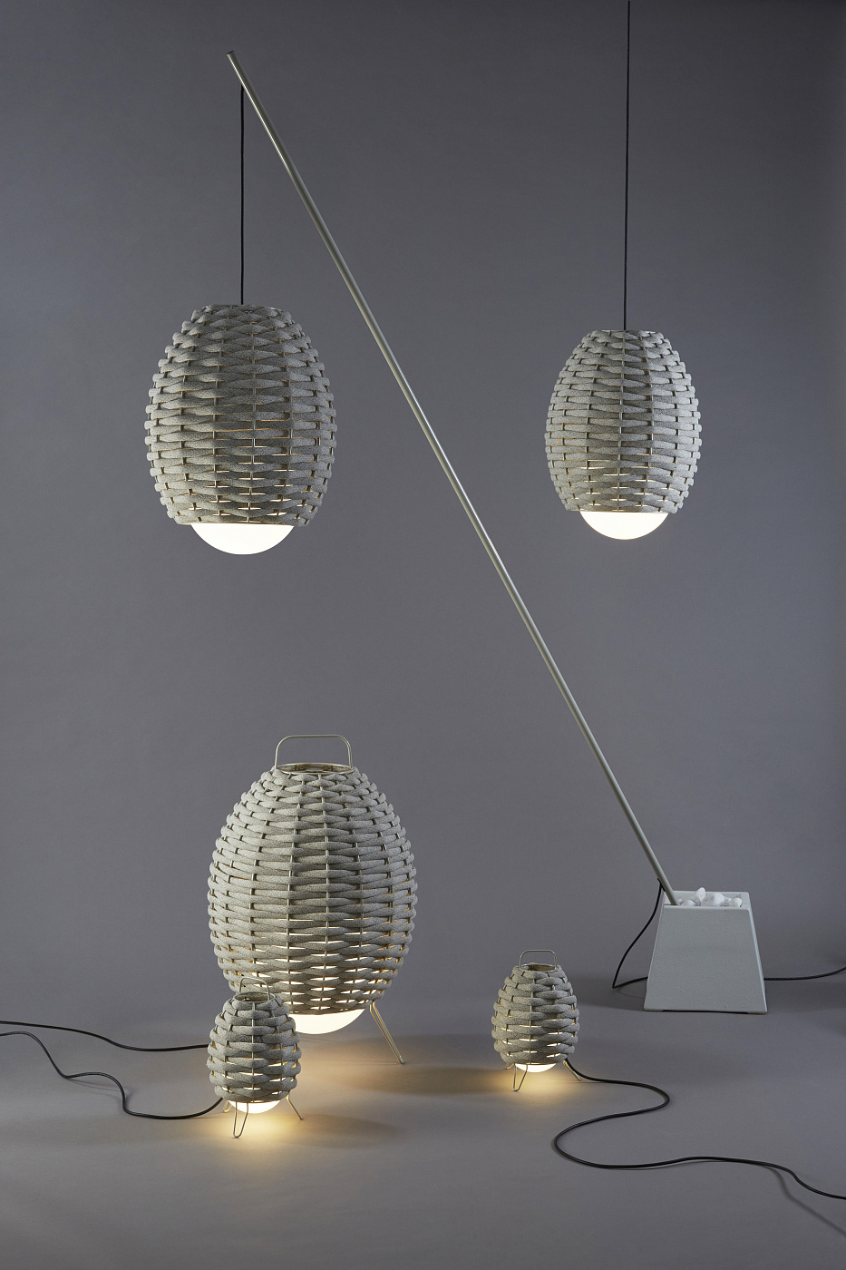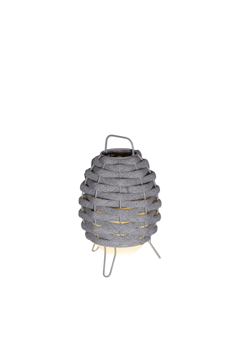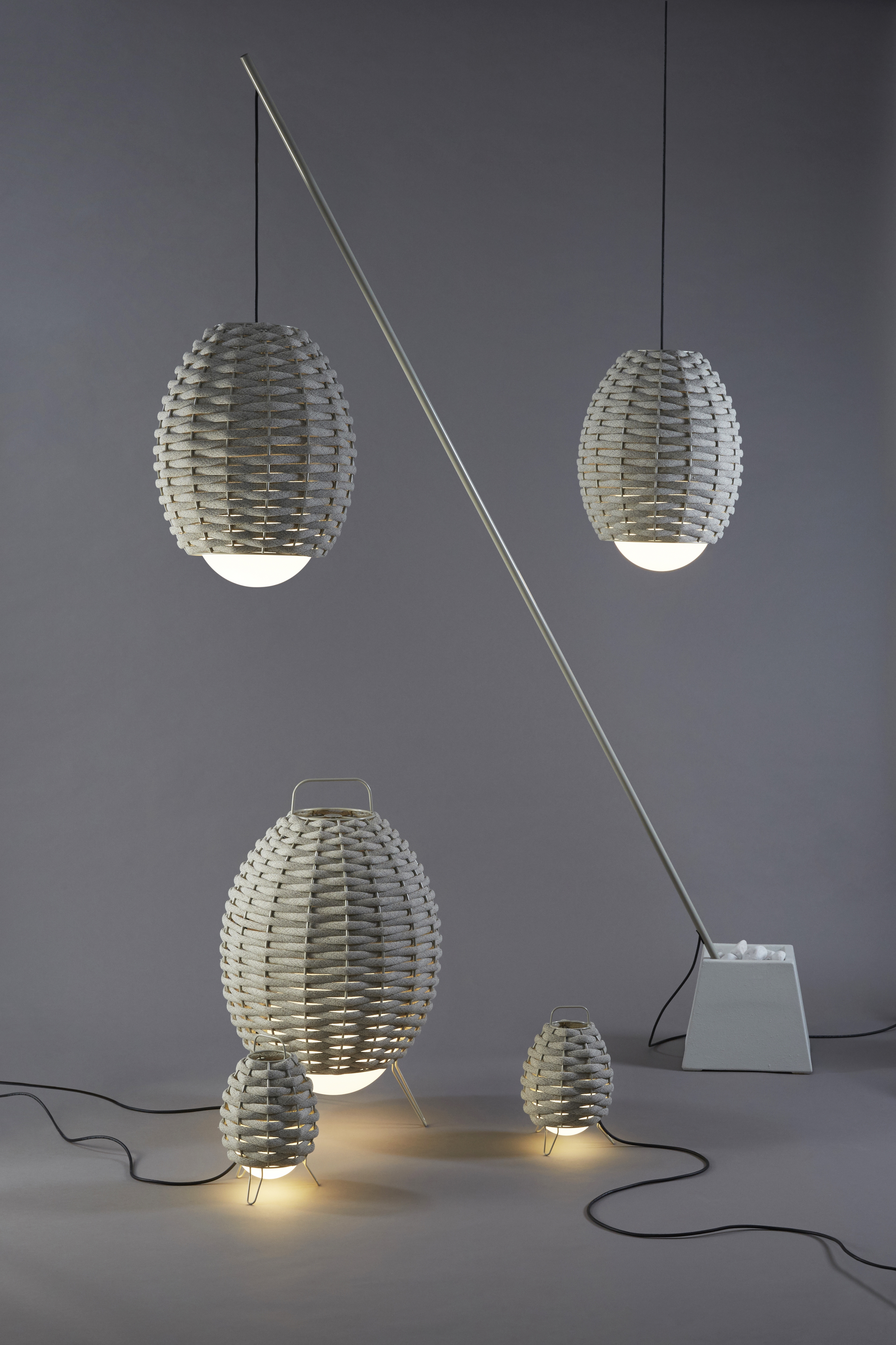 С металлическим каркасом для внутреннего и/или наружного применения. Обработка нанофорезом, окрашенная в серый цвет (RAL7032). Витой абажур из текстильного материала, обработанного УФ-излучением. Светодиодная лампочка находится внутри большой сферы из триплексного опалового стекла. Создано вручную. Он отличается своей органической формой и теплотой светового пятна на своих экранах. Все они имеют форму эллиптического шара, оплетенного неопреном, покрытым решетчатой тканью.