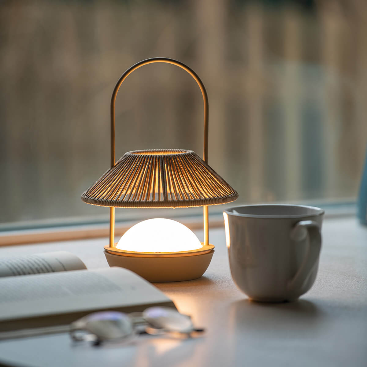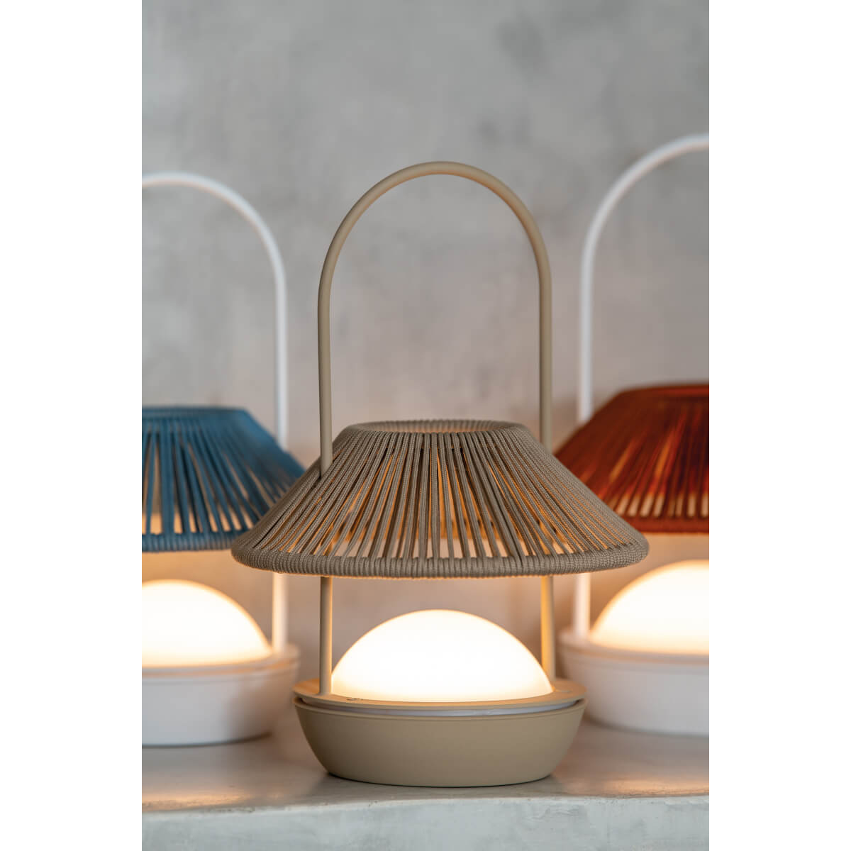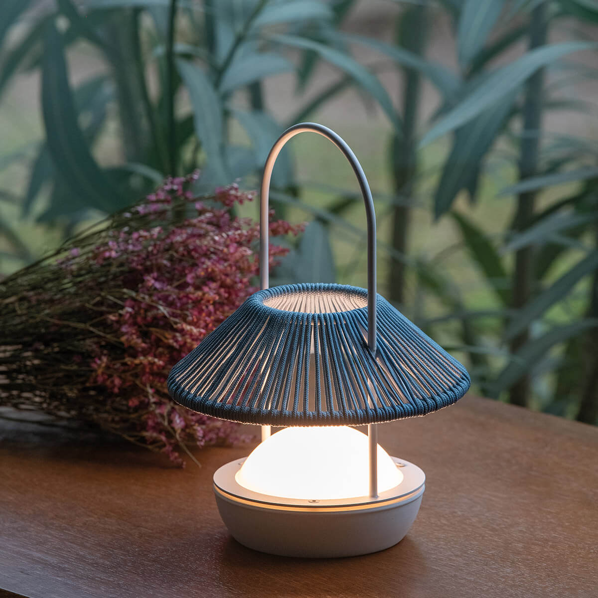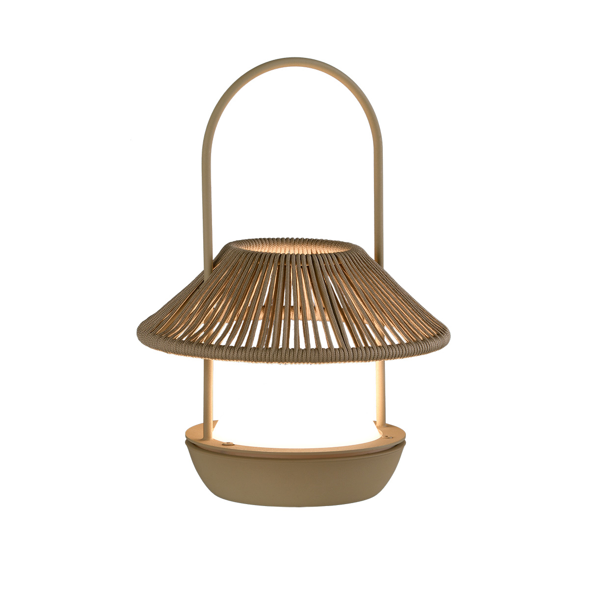 Переносная настольная лампа с индукционной аккумуляторной батареей. Белая или песочная металлическая конструкция и абажур из переработанного шнура. Подходит для использования в помещении и на улице (IP54).