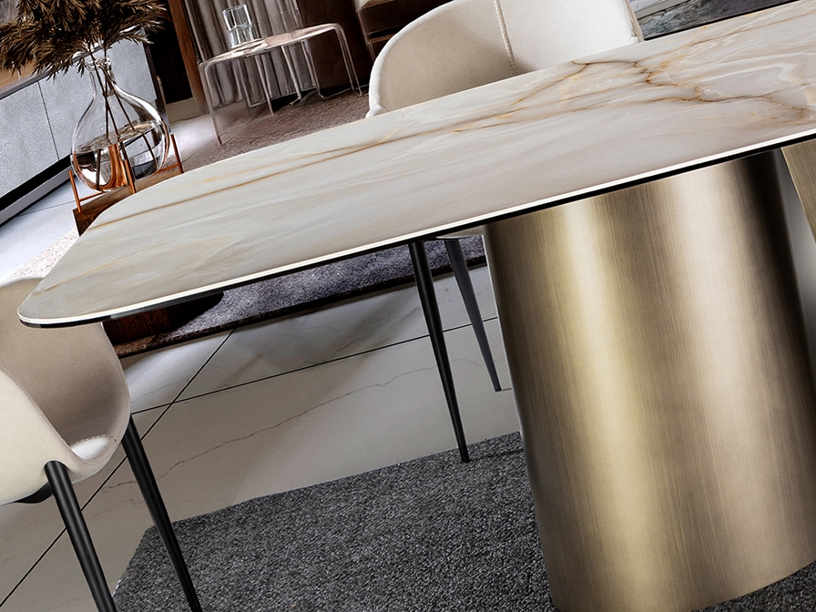 Обеденный стол из металла с отделкой из матовой латуни. Столешница из ламинированного фарфора и стекла с декором из прожилок мрамора.