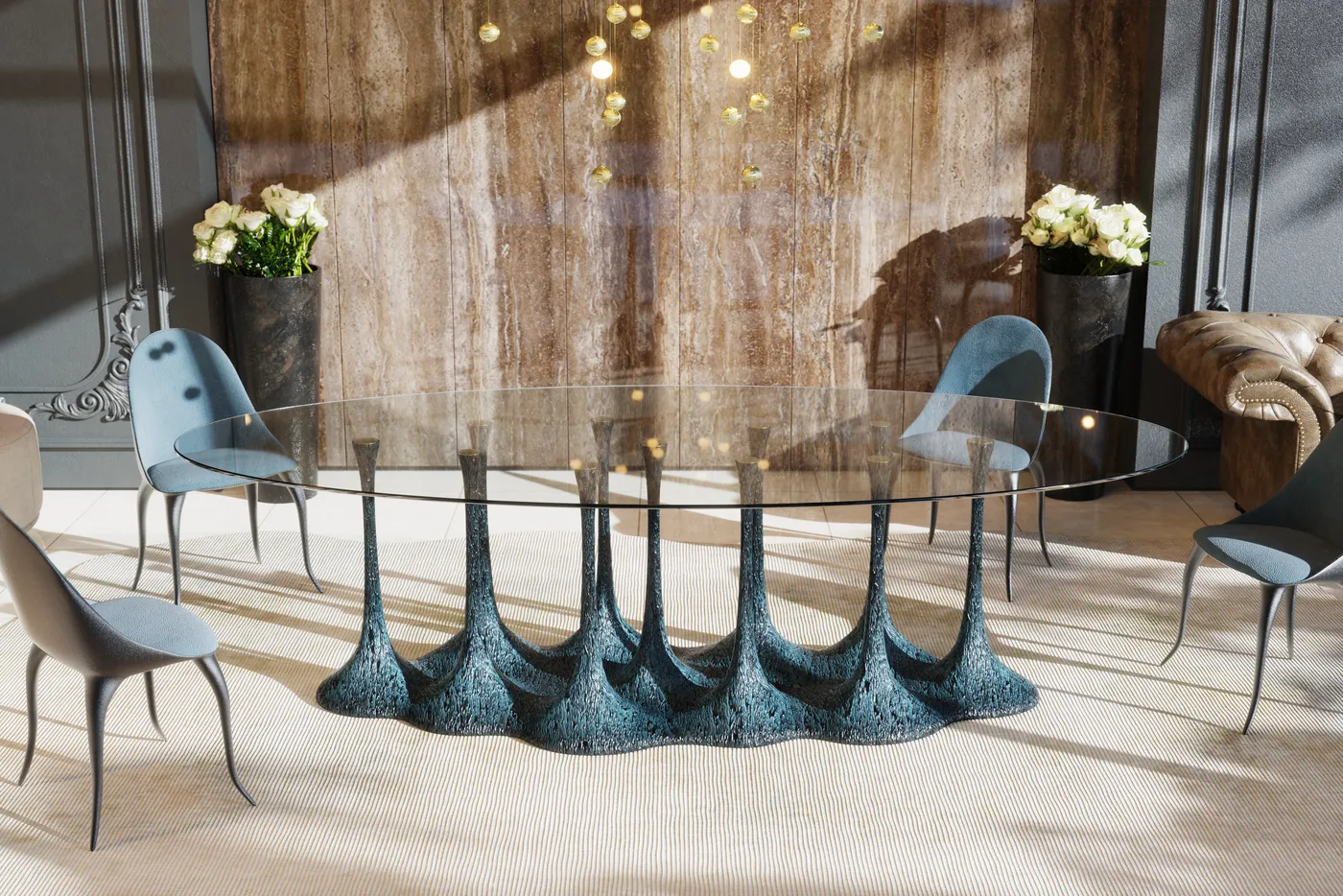 Настоящий шедевр, который привнесет в вашу столовую чарующую красоту тропических лесов Амазонки. Благодаря своему сложному основанию, напоминающему лес текстурированных ветвей дерева, этот изысканный стол демонстрирует непревзойденное мастерство и художественное видение Karpa. Этот обеденный стол Amazónia имеет пленительную стеклянную столешницу, элегантно дополняющую сложный дизайн основания. Изготовленный вручную с тщательным вниманием к деталям, этот предмет премиум-класса отражает приверженность Karpa созданию эксклюзивной и скульптурной мебели. Настраиваемый с точки зрения отделки и размеров, обеденный стол Amazónia позволяет вам создать уникальный и персонализированный центральный элемент, воплощающий гармонию природы и роскоши.