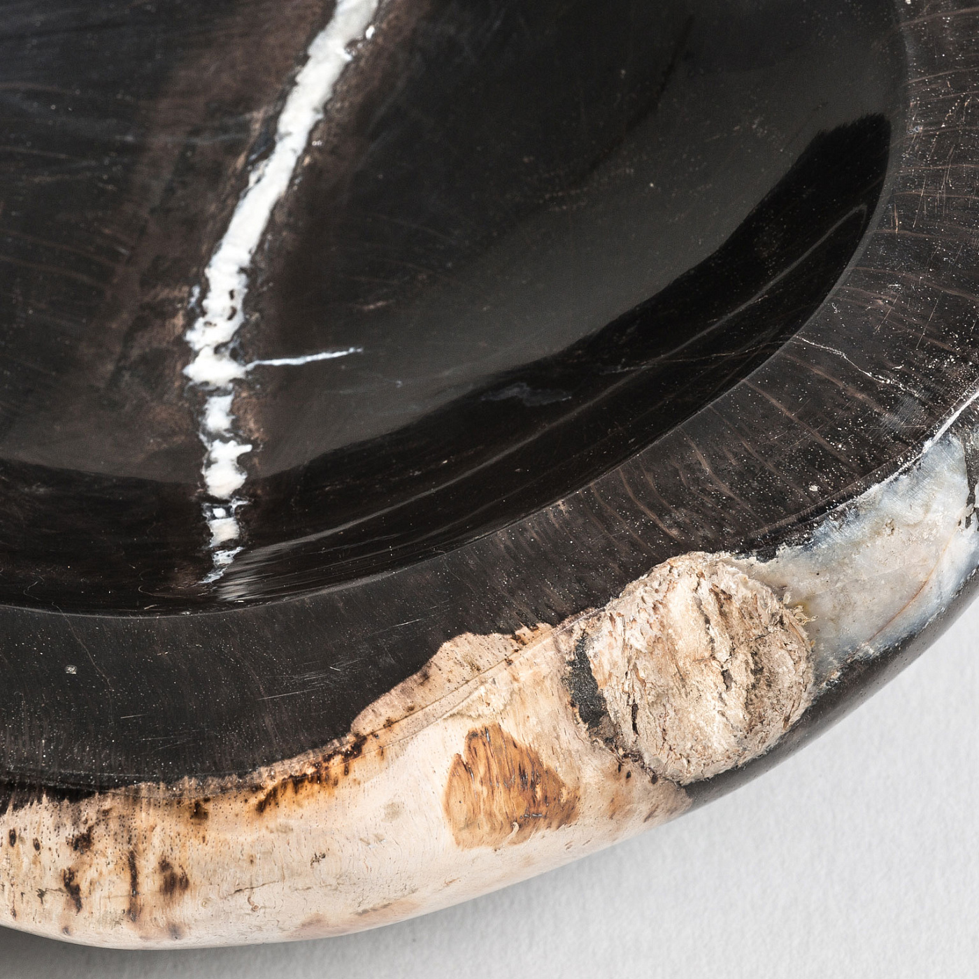 Чаша сделана из цельного куска окаменевшей древесины. Сверху она художественно окрашена черной и прозрачной эмалью, которая придает ей состаренный вид и защищает от влаги и ультрафиолета.