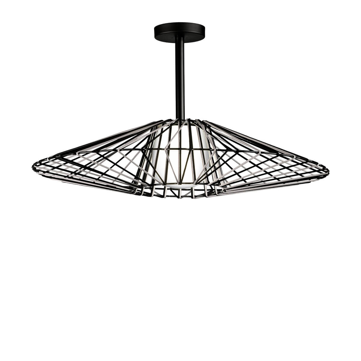 Потолочный светильник с абажуром диаметром 80 см из плетеного вручную шнура из переработанных пластиковых бутылок на черной металлической конструкции. Выберите один или два стандартных цвета шнуров для комбинирования. IP66 для использования на открытом воздухе.