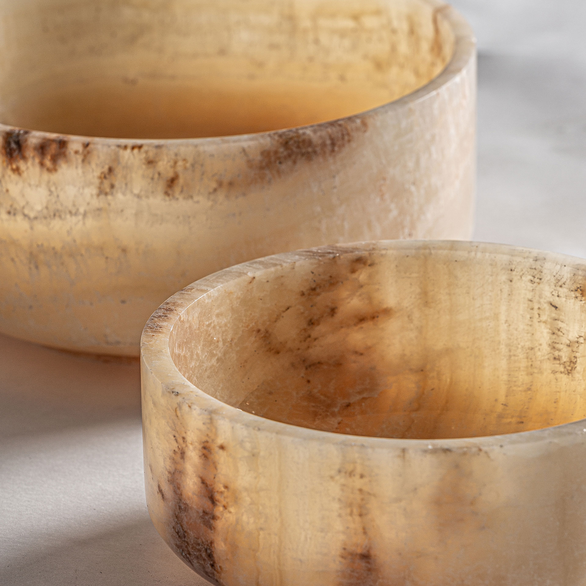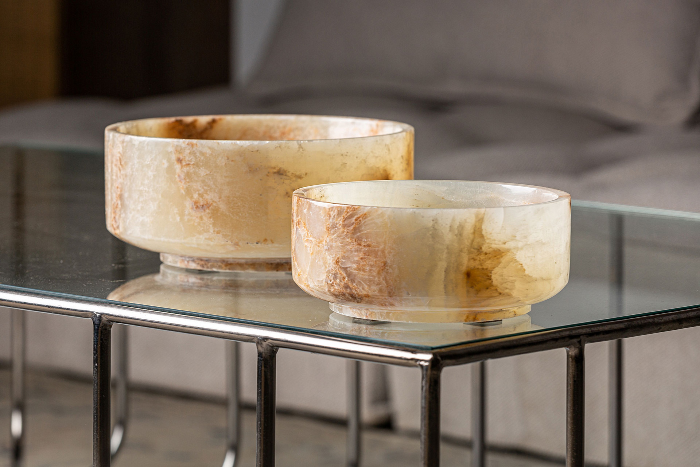 Подносы имеют круглую форму. Они полностью сделаны из натурального оникса цвета слоновой кости. Природный рисунок на каждом изделии уникальный. И отсутствие отделки в полной мере демонстрируют всю их красоту.